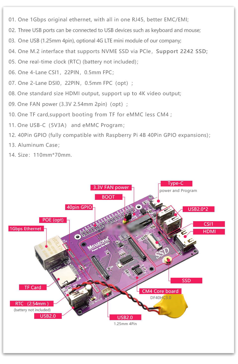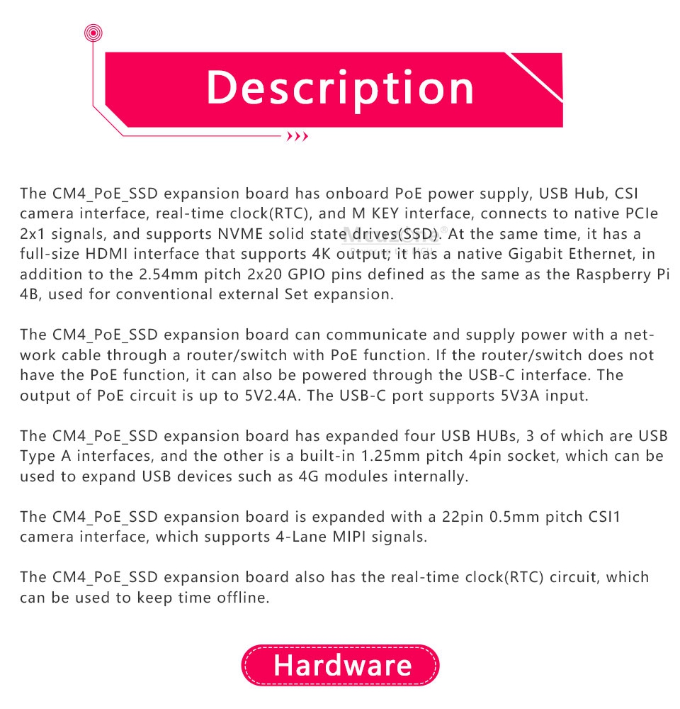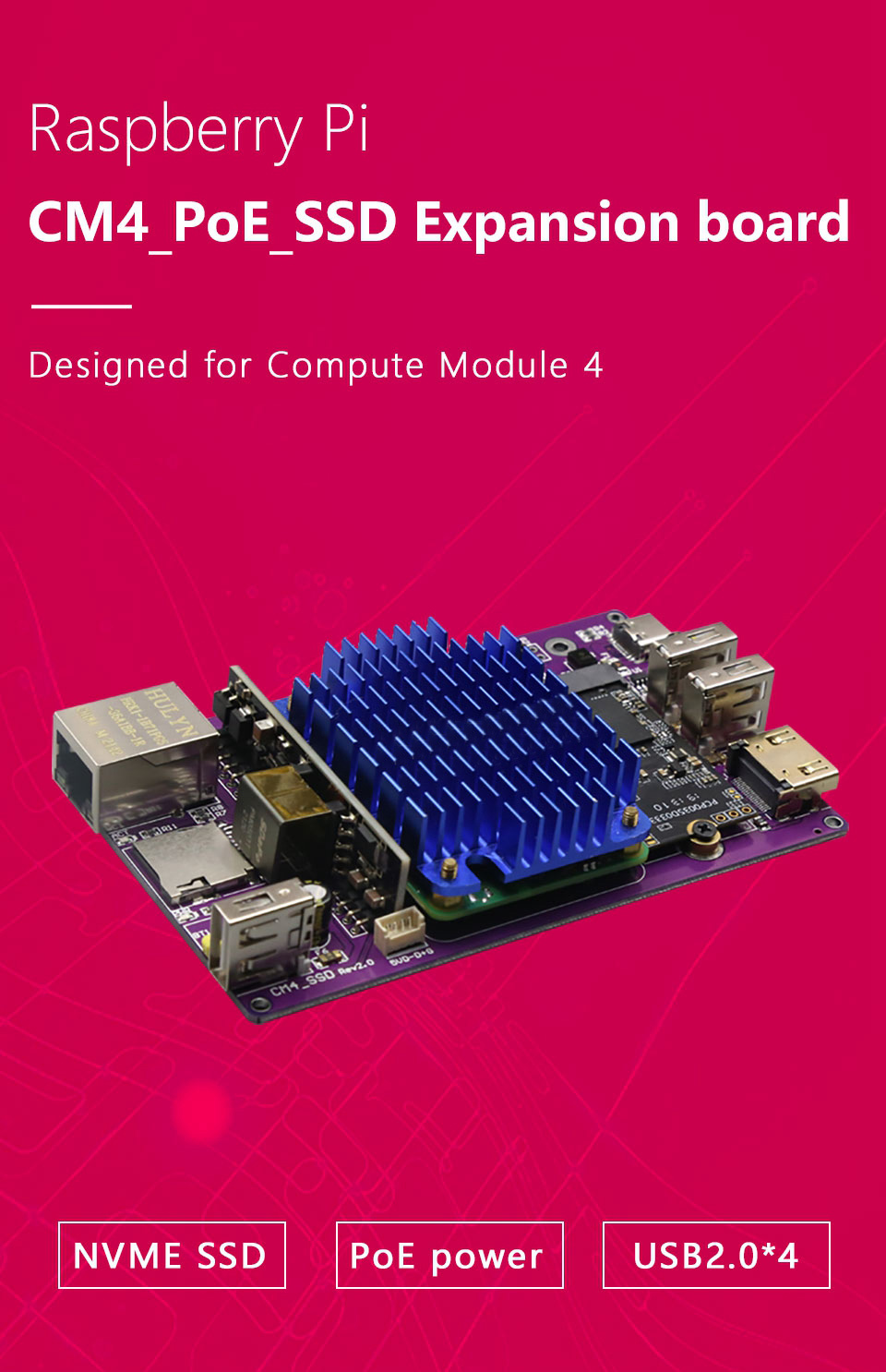 - The CM4_PoE_SSD expansion board has onboard PoE power supply, USB hub, CSI camera interface, real-time clock (RTC), and M KEY interface, connects to native PCIe 2x1 signals, and supports NVME solid state drives (SSD). At the same time, it has a full-size HDMI interface that supports 4K output; it has a native Gigabit Ethernet, in addition to the 2.54mm pitch 2x20 GPIO pins defined as the same as the 4B for Raspberry Pi,, used for conventional external set expansion.
