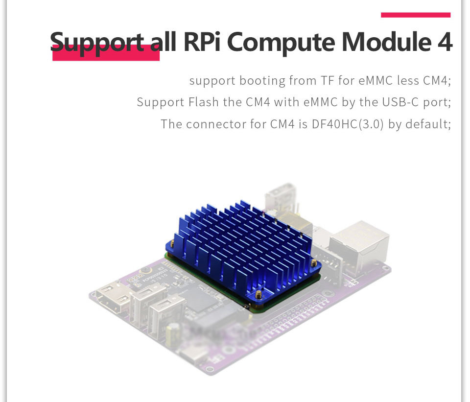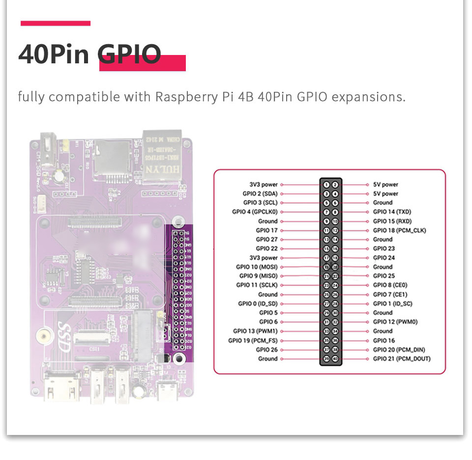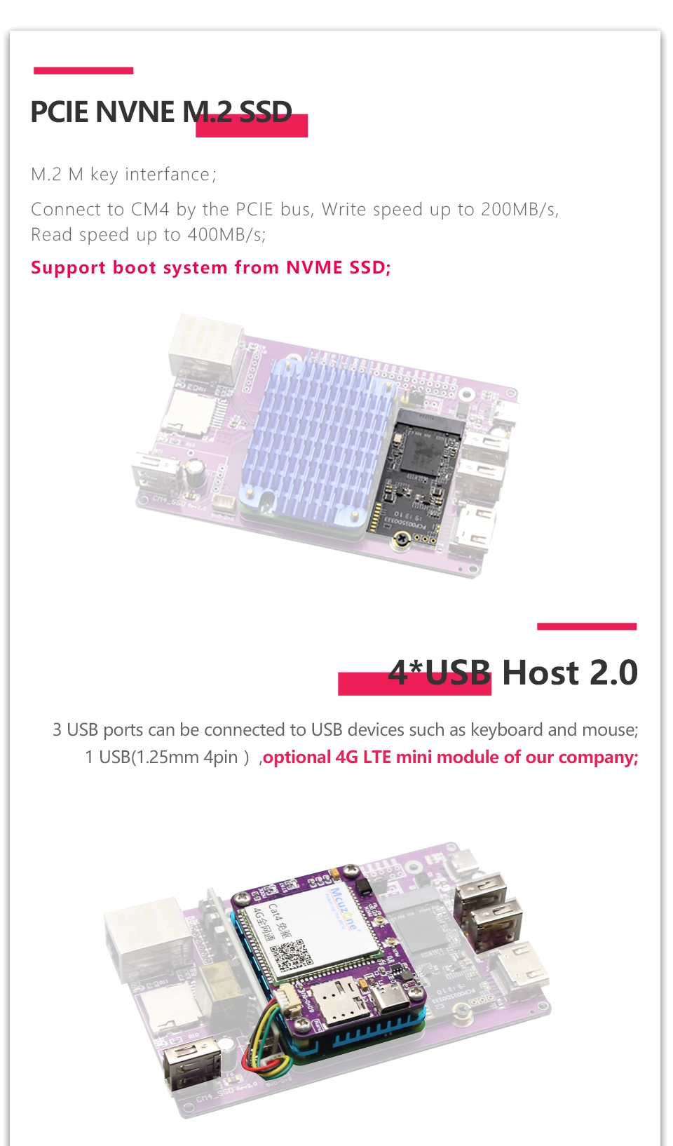 - The CM4_PoE_SSD expansion board has onboard PoE power supply, USB hub, CSI camera interface, real-time clock (RTC), and M KEY interface, connects to native PCIe 2x1 signals, and supports NVME solid state drives (SSD). At the same time, it has a full-size HDMI interface that supports 4K output; it has a native Gigabit Ethernet, in addition to the 2.54mm pitch 2x20 GPIO pins defined as the same as the 4B for Raspberry Pi,, used for conventional external set expansion.