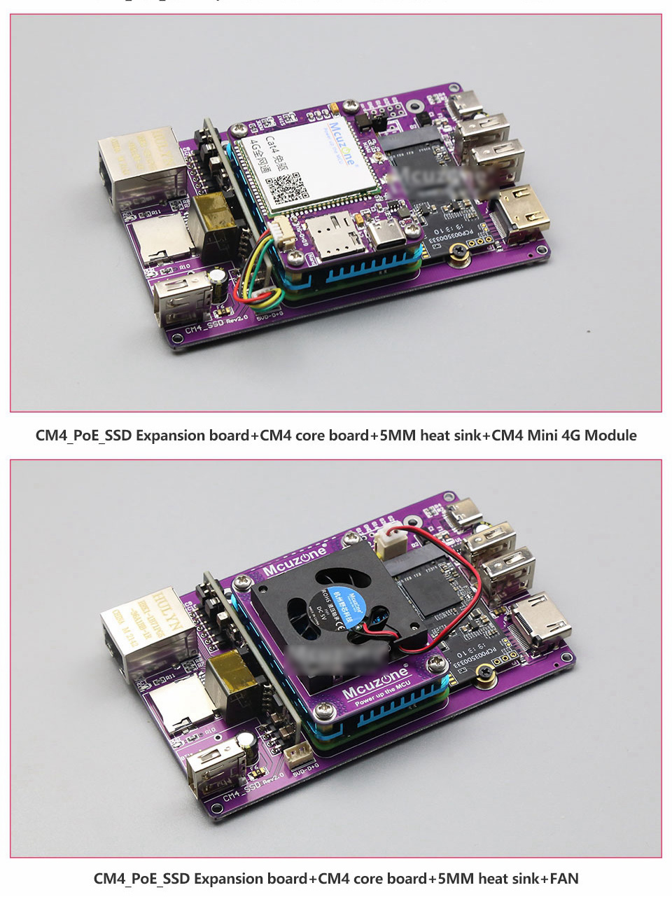 - The CM4_PoE_SSD expansion board has expended four USB HUBs, 3 of which are USB Type-A interfaces, and the other is a built-in 1.25mm pitch 4pin socket, which can be used to expend USB devices such as 4G modules internally.