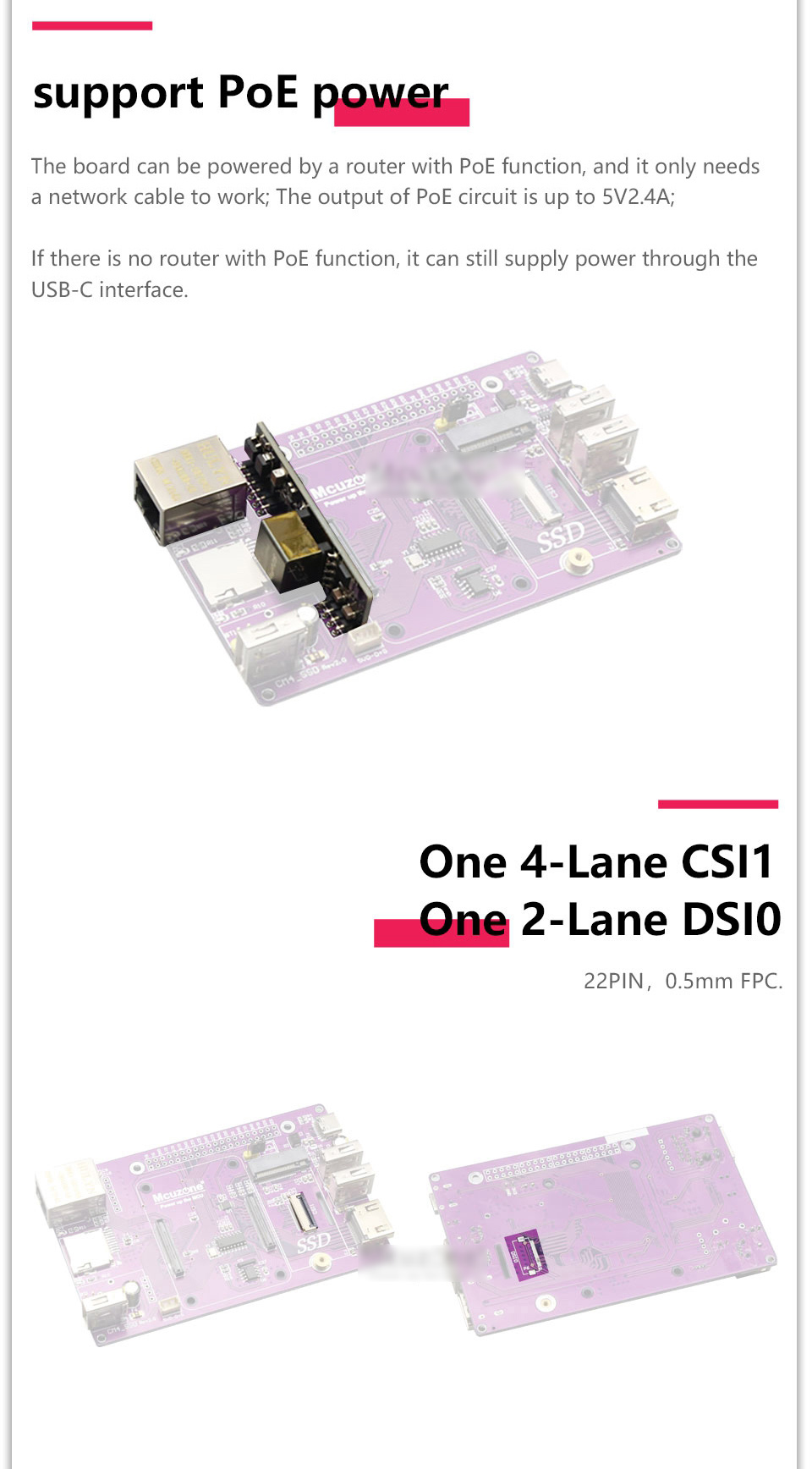 - The CM4_PoE_SSD expansion board is expanded with a 22pin 0.5mm pitch CSI1 camera interface, which supports 4-Lane MIPI signals.