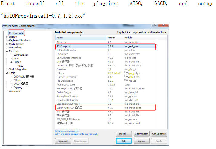 1. First open the player "File-Parameter Options", click "Components" on the left, and then click "Install" in the lower right corner to install the downloaded ASIO plug-in: foo_out_asio.fb2k-component (first unzip the downloaded plug-in package ), press "OK" and restart FOOBAR, after the installation is complete, as shown below