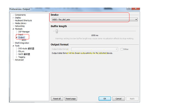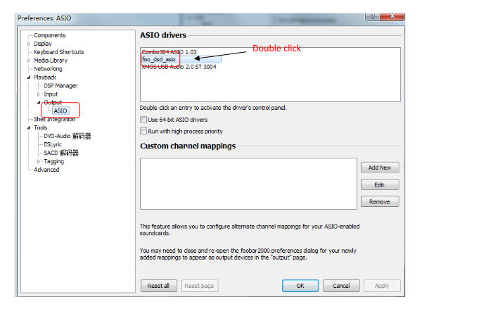 4. Click "ASIO" in the "Output" drop-down menu on the left, double-click on the right: foo_dsd_asio, as shown below