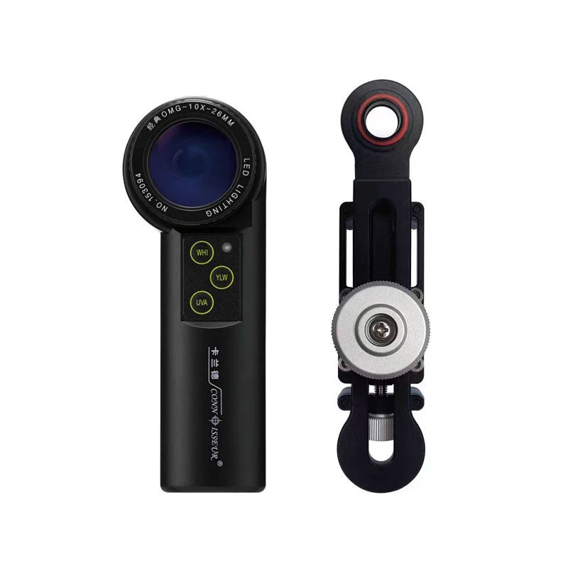 - 9-LED long-wave ultraviolet light: The light group emits multi-angle ultraviolet light. The light is shadowless lamp. Used to inspect the fluorescent anti-counterfeiting marks of banknotes, stamps and bills, and can also assist in detecting porcelain repair, precious jade repair glue injection marks, etc. in complete dark light.