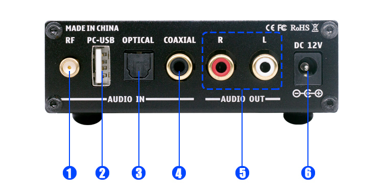 5. R, L: RCA analog output port (Amplifier/active speaker/headphone amp)