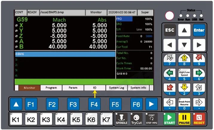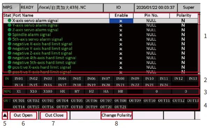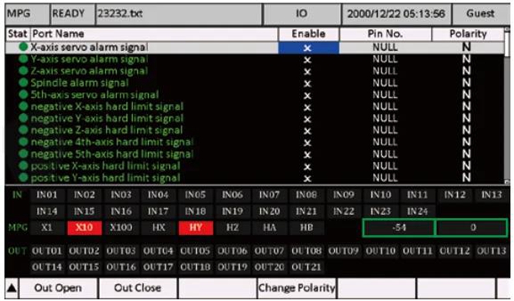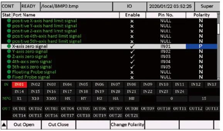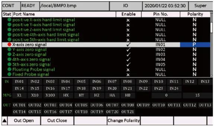 - DDCS-Expert controller creates a self-defined IO ports method. According to the user’s favorite, the users can define the input and output ports as which they want. In the IO page, the users can define the input port and output port, and also can inspect the input/output port and MPG status. Power on the DDCS-Expert controller, system popup the main page, and press F4 Key to go to the IO Port Page: