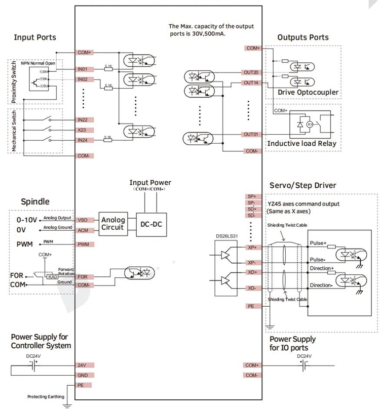 - The power supply for the controller is 24VDC, minimum current is 0.5A.
