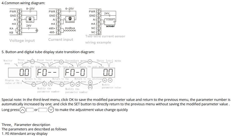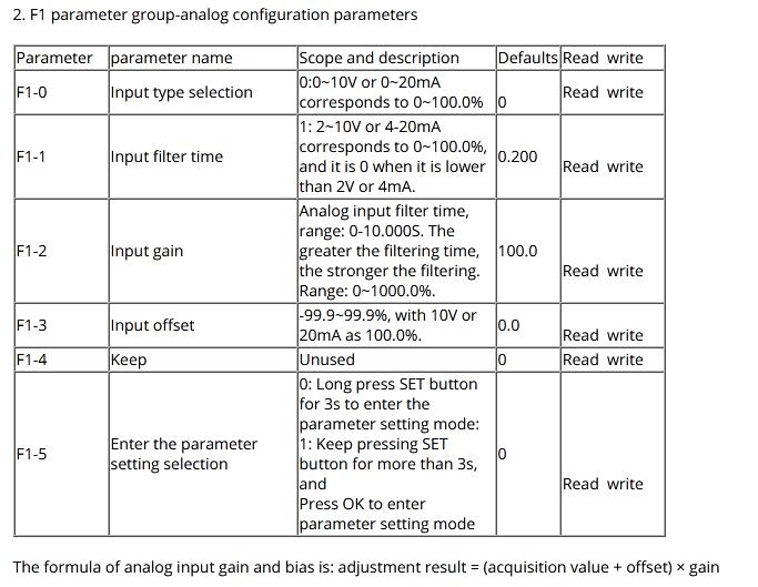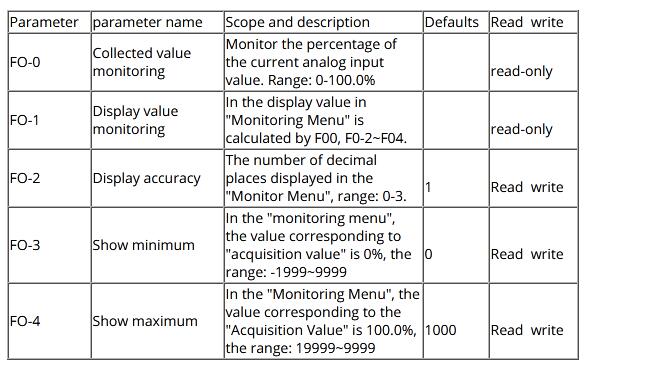 4. It is displayed as a percentage by default. You can also set your own display range through F0-2 ~ F0-4.