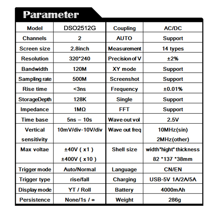 DSO2512G 120M bandwidth oscilloscope boasts powerful functions, like adoption of chips for ARM and FPGA. It also can output various waveforms of 2.5V amplitude such as sine waves, half waves and so on. Come and try it, it will not let you down.