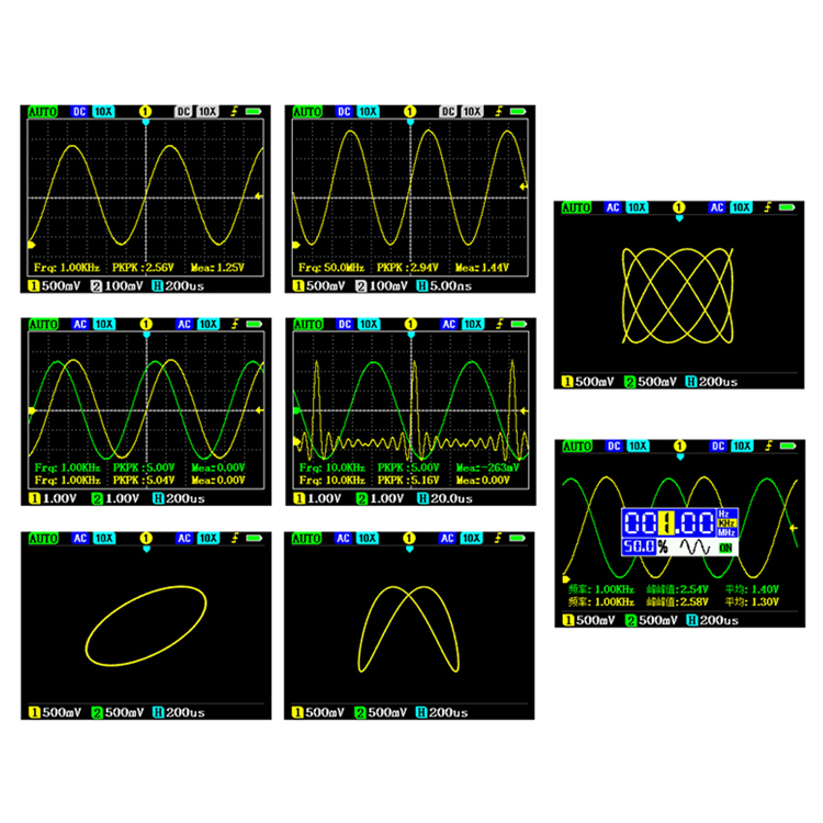 - The bottom of the oscilloscope can output a variety of waveforms of 2.5V amplitude such as sine waves, square waves, triangle waves, half waves, among which the frequency adjustment ranges of sine waves is 0~ 10MHz, the frequency ranges of other waveforms is 0~2MHz, and the accuracy is up to 0.1Hz. Signal generators are widely used, such as square waves for new probe calibration, driving MOS tube, etc., sine waves can be used for testing audio distortion, etc.
