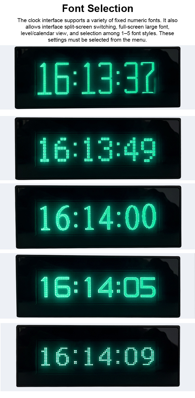 * Font Selection: The clock interface supports a variety of fixed numeric font choices