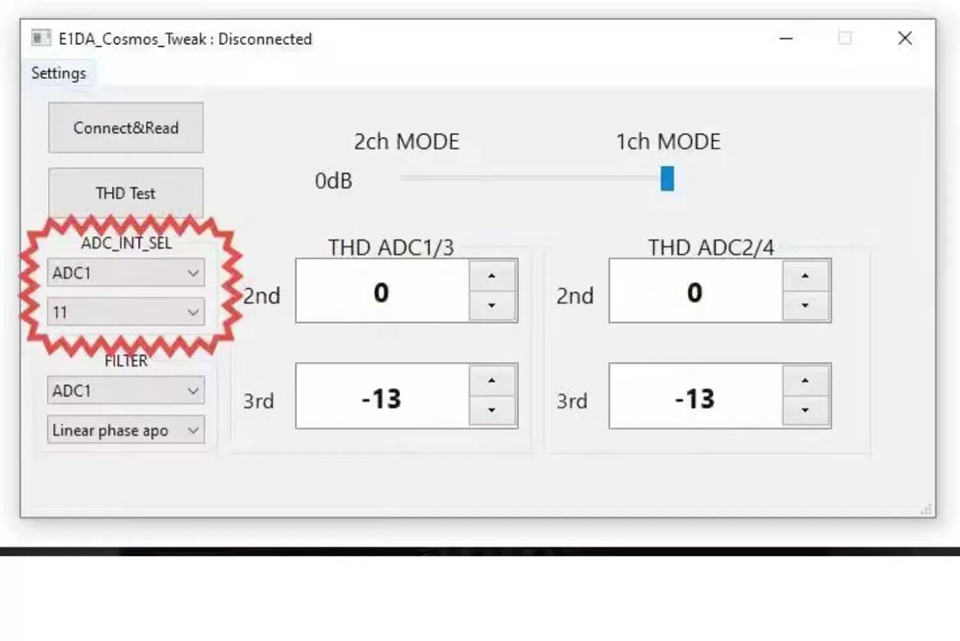 - For example, after inserting the ADC, run TweakCosmosQT.exe and click the 【Connect&Read】 button to see the calibration value of THD compensation.