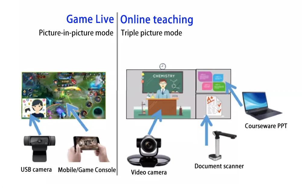 - Video mixing: picture-in-picture, 4-split screen, 9-split screen, custom