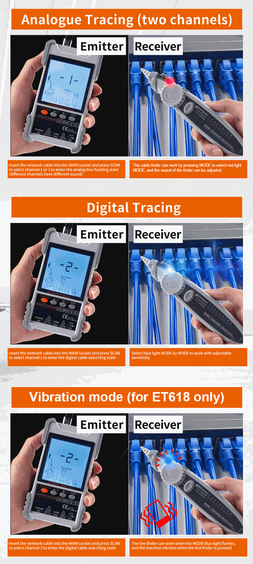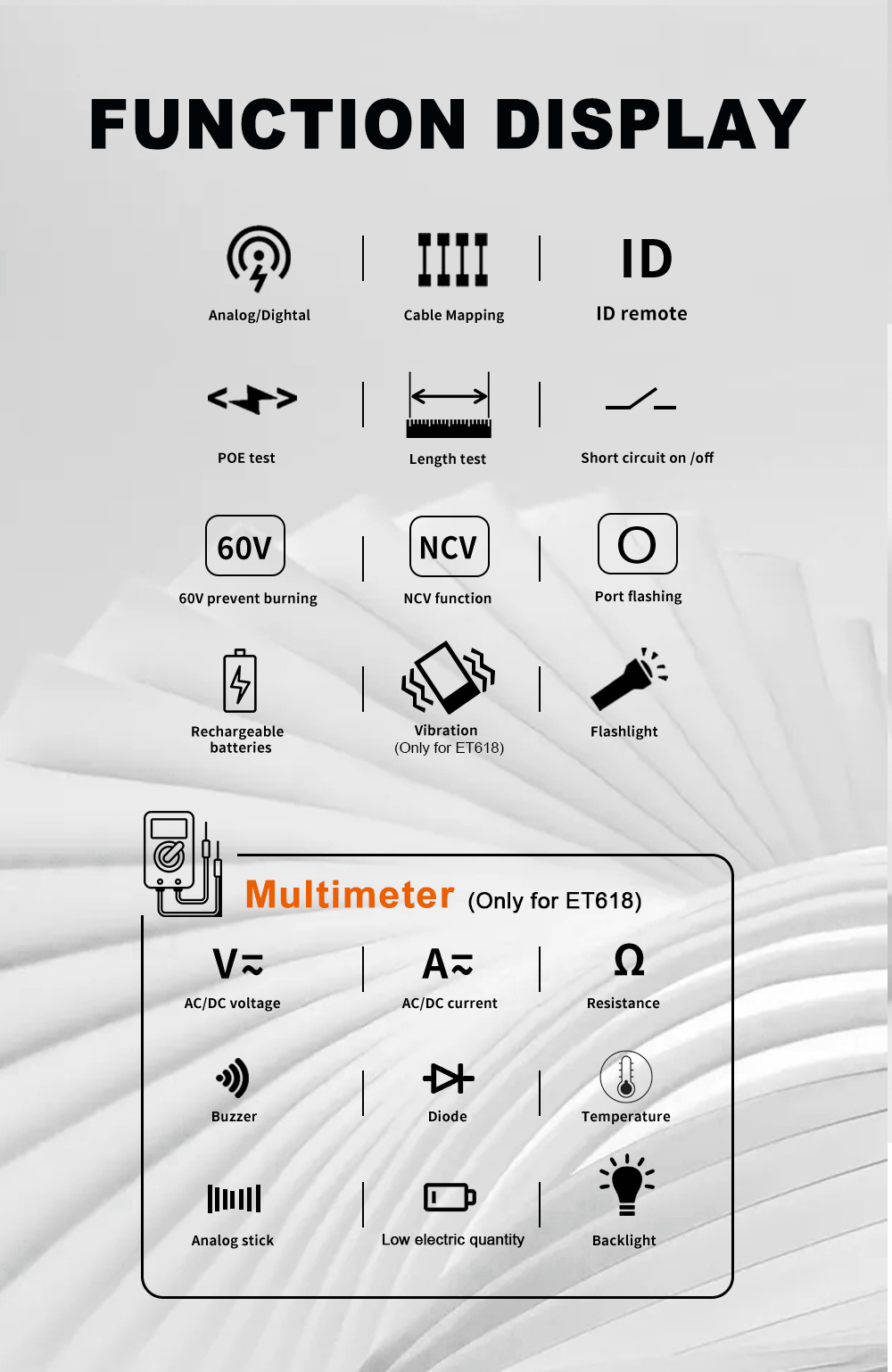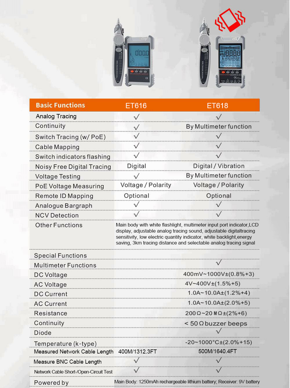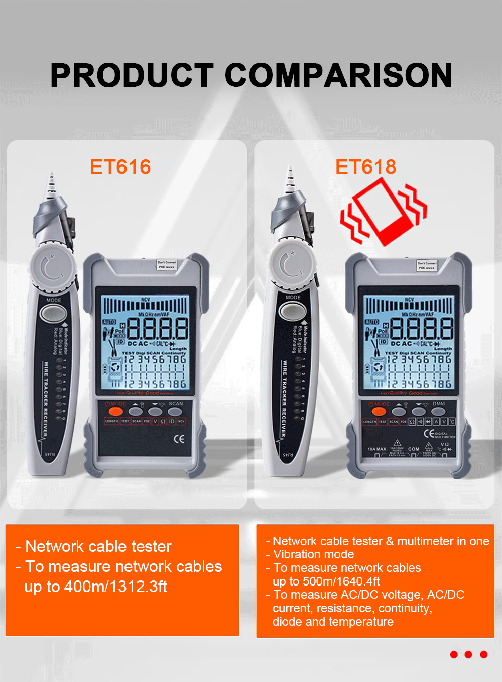 - ET618: It can be used to measure network cables up to 500m/1640.4ft. Only ET618 can be used as a multimeter.