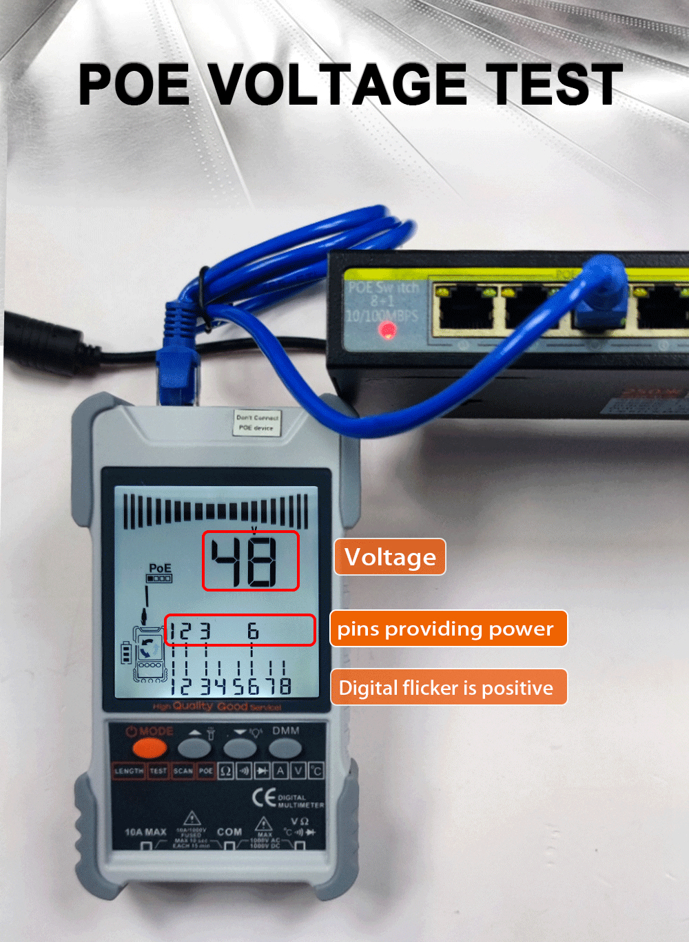 - POE Test: POE testing can check cable mapping polarity and voltage of POE network switches.