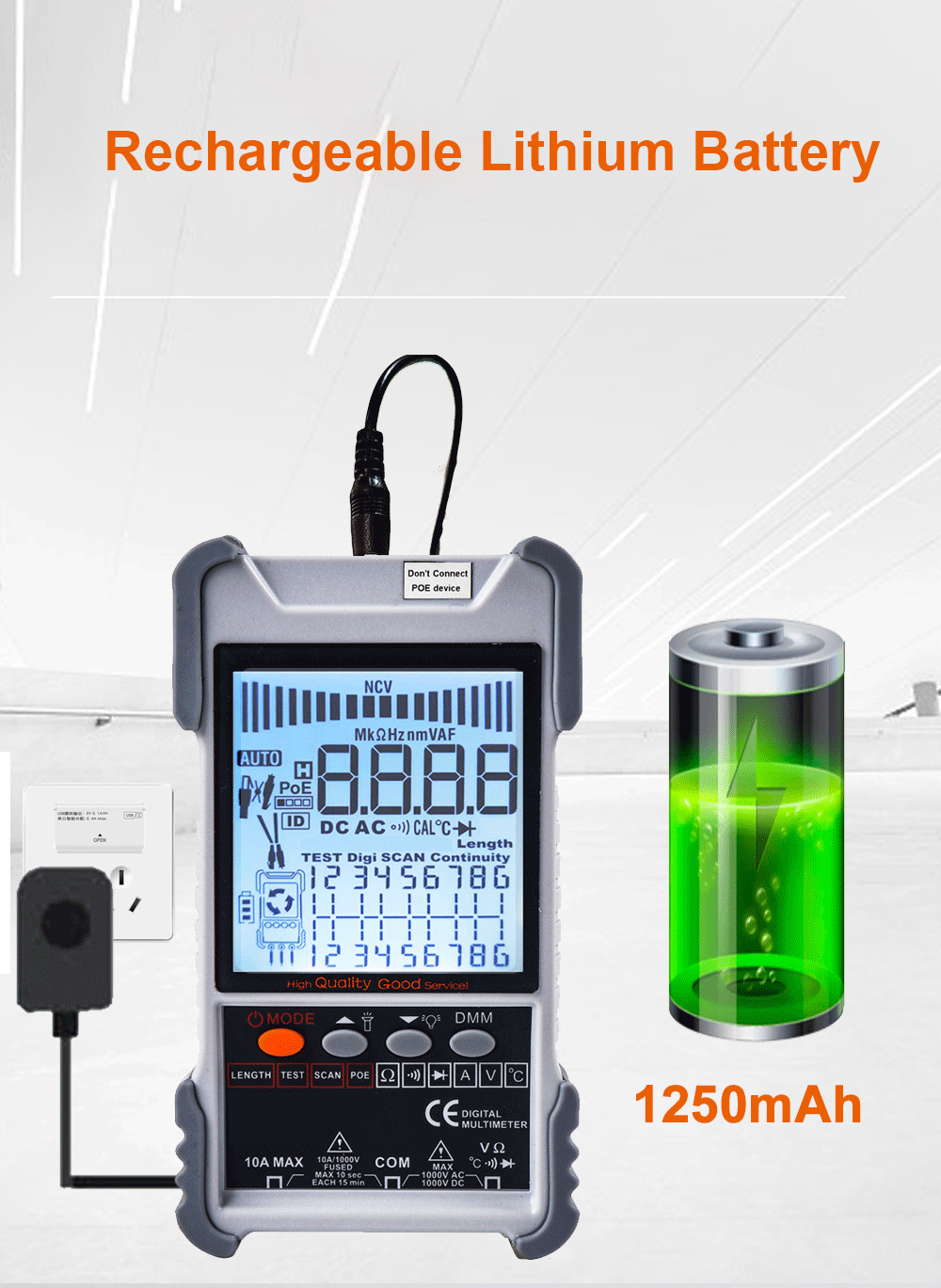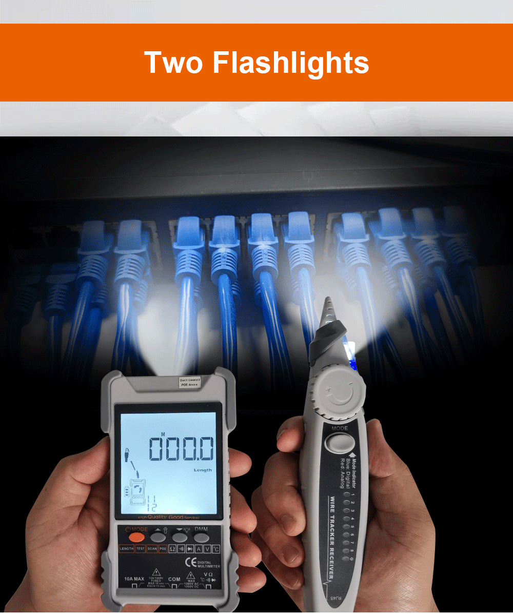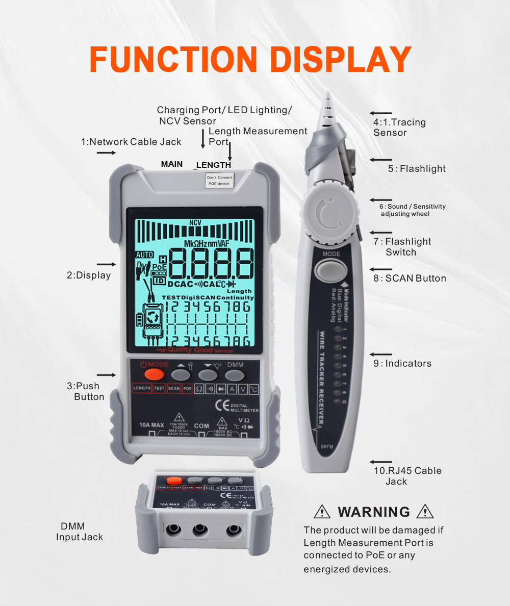- Multifunctional Cable Tester: This cable tester has the function of analog tracing, cable mapping, PoE voltage measuring, adjustable digital tracing sensitivity, etc.