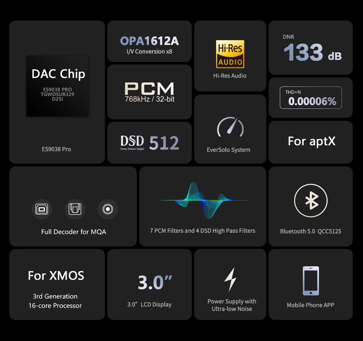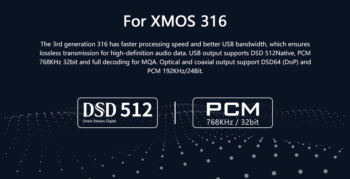 - Up to DSD512 Native and PCM 768KHz at 32Bit decoding