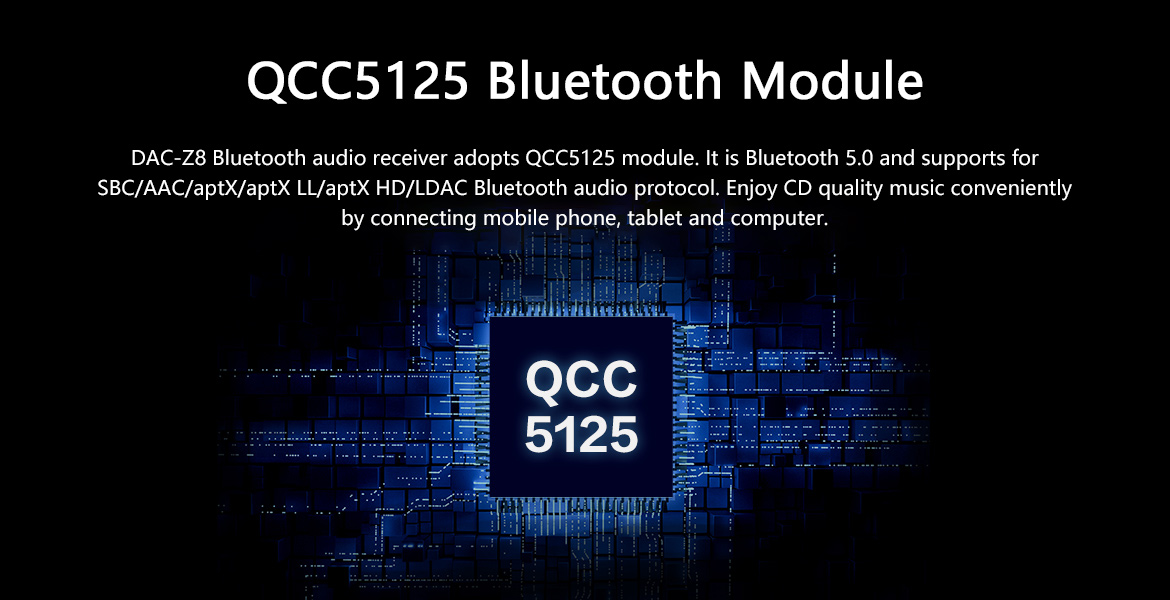 - Bluetooth Audio Input: QCC5125 Bluetooth module, BT5.0. Support for SBC/AAC/aptX/aptX LL/aptX HD/LDAC Bluetooth protocol