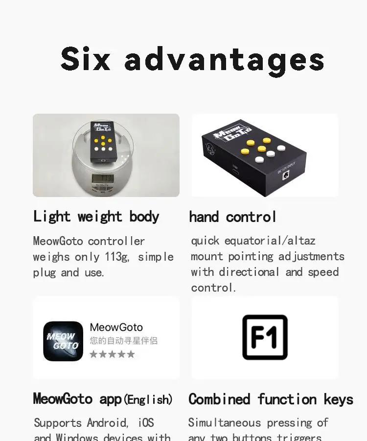 - Meow Goto app (English): supports for Android, for iOS and for Windows devices with built-in star charts and powerful features, allowing easy imaging.