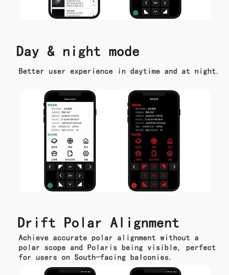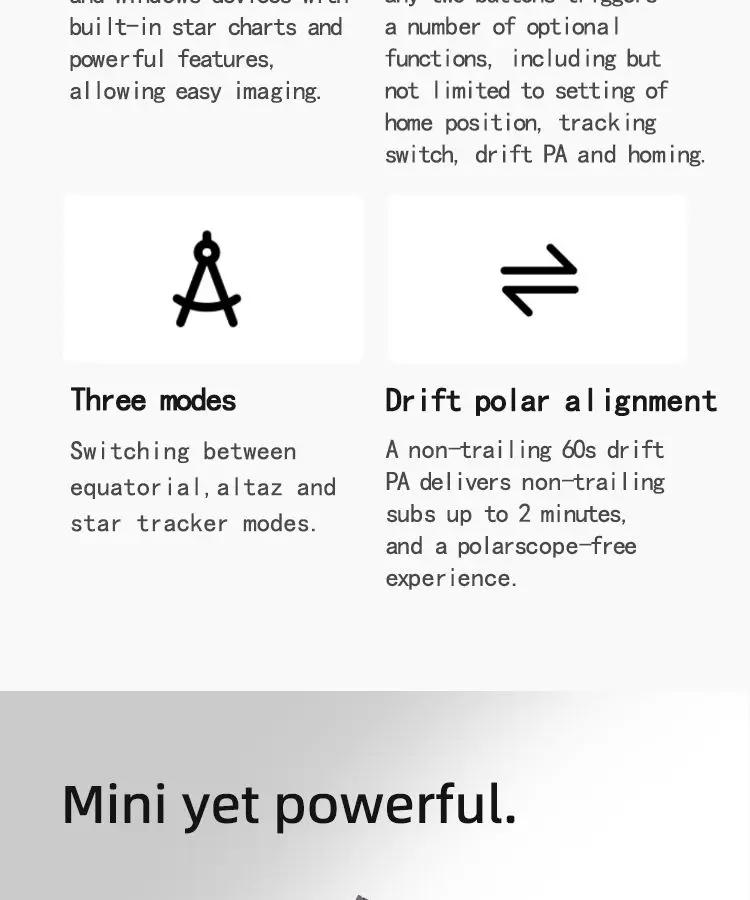 - Drift polar alignment: a non-trailing 60s drift PA delivers non-trailing subs up to 2 minutes, and a polarscope-free experience.