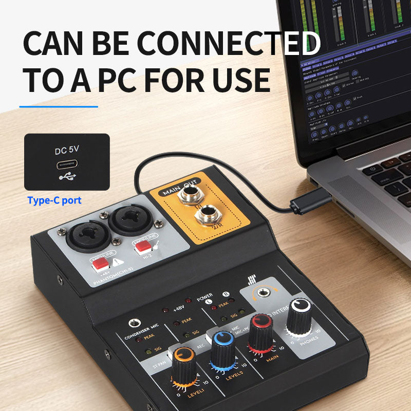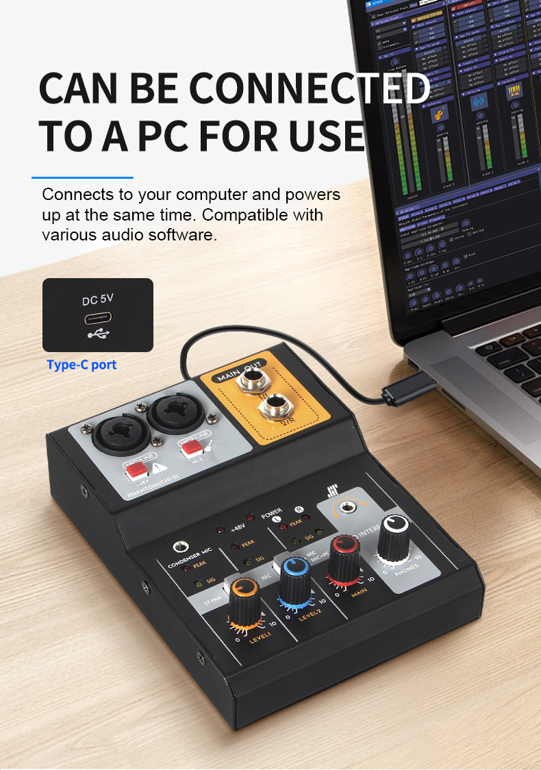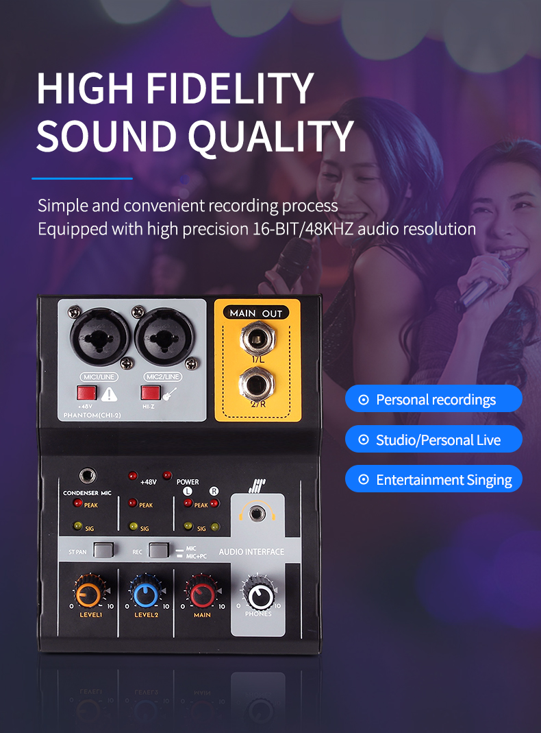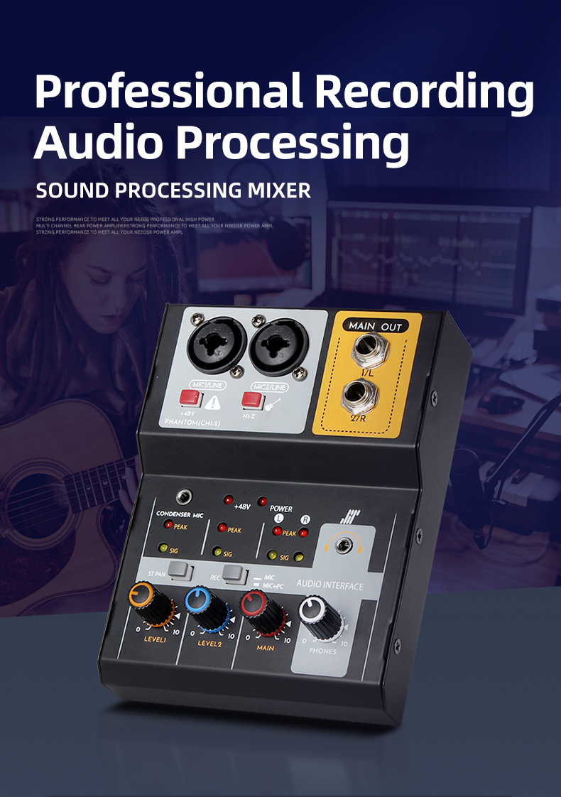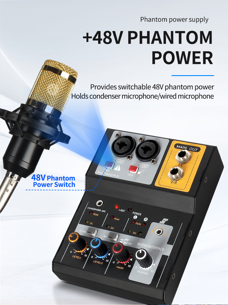- 48V phantom power supply provides polarization voltage for input port. It is convenient to connect condenser microphones