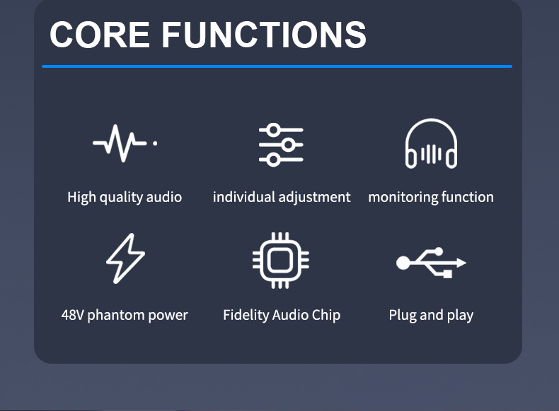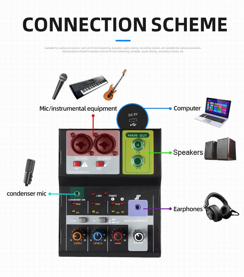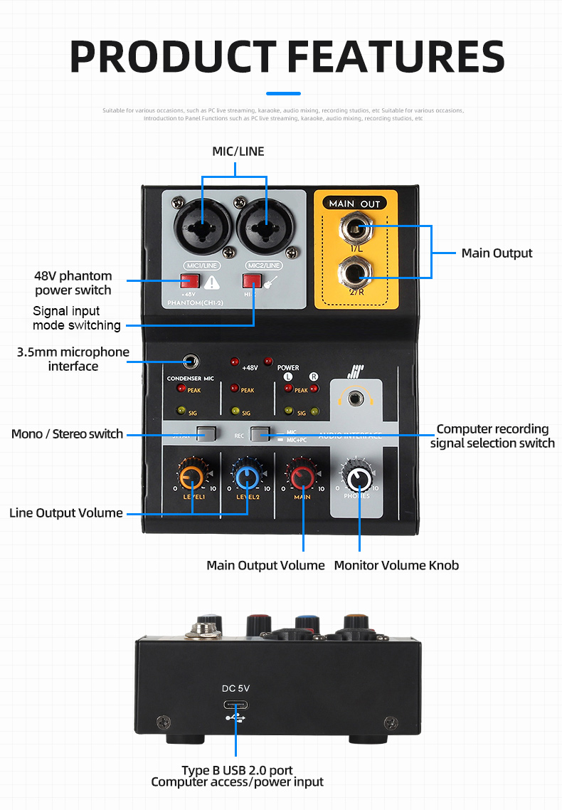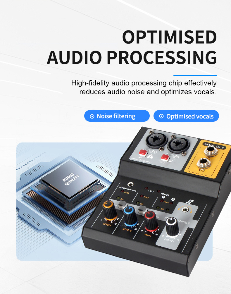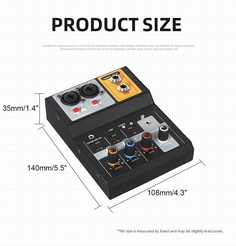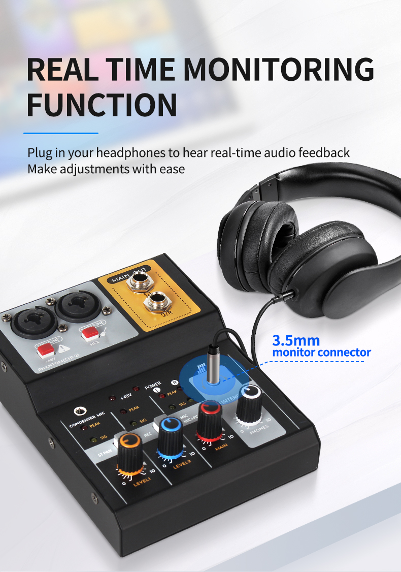 - 48V phantom power supply provides polarization voltage for input port. It is convenient to connect condenser microphones