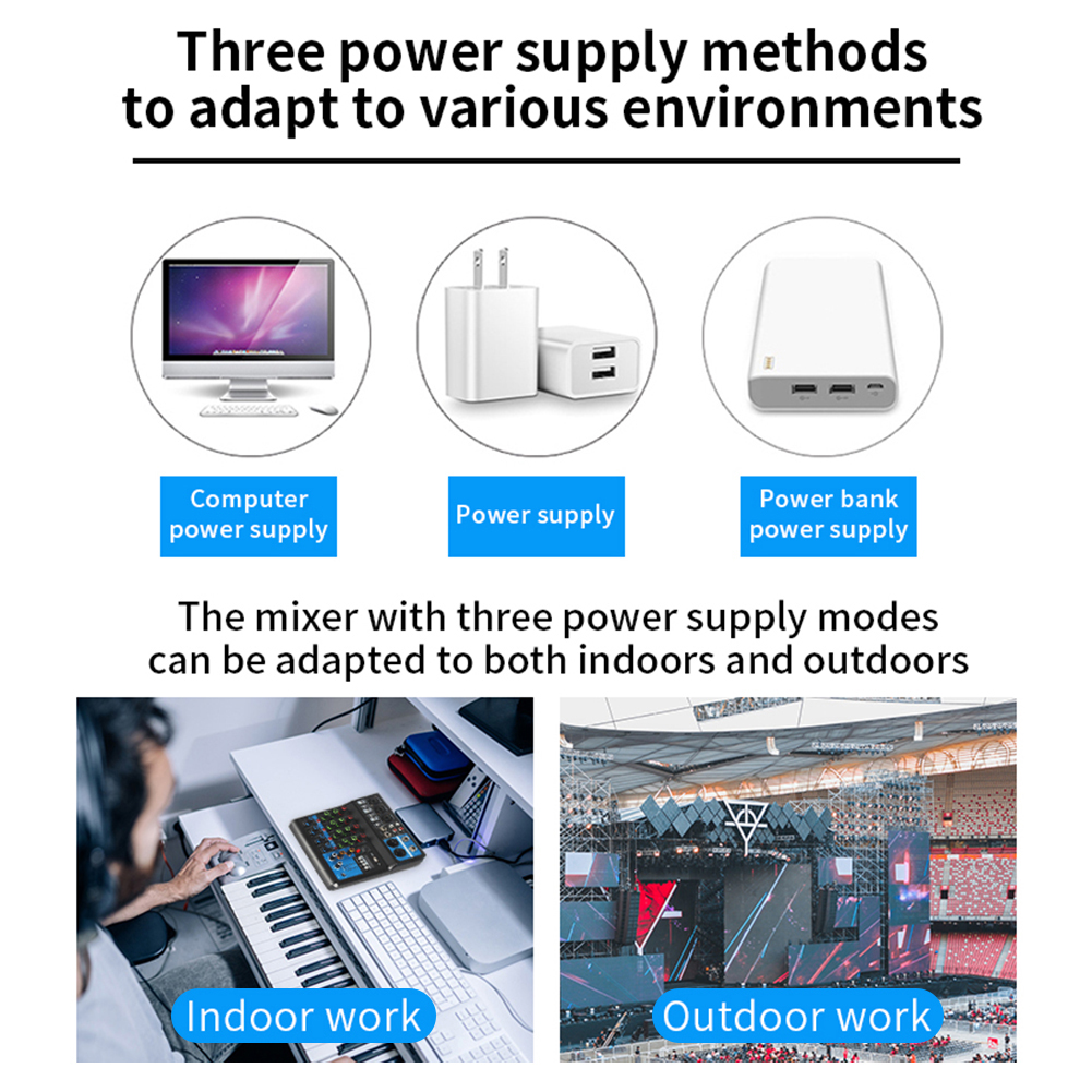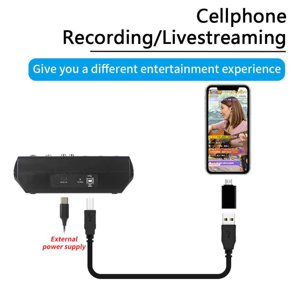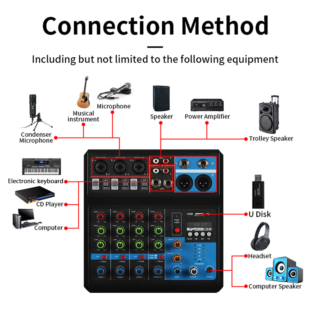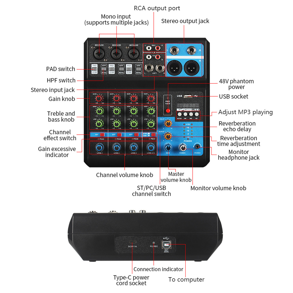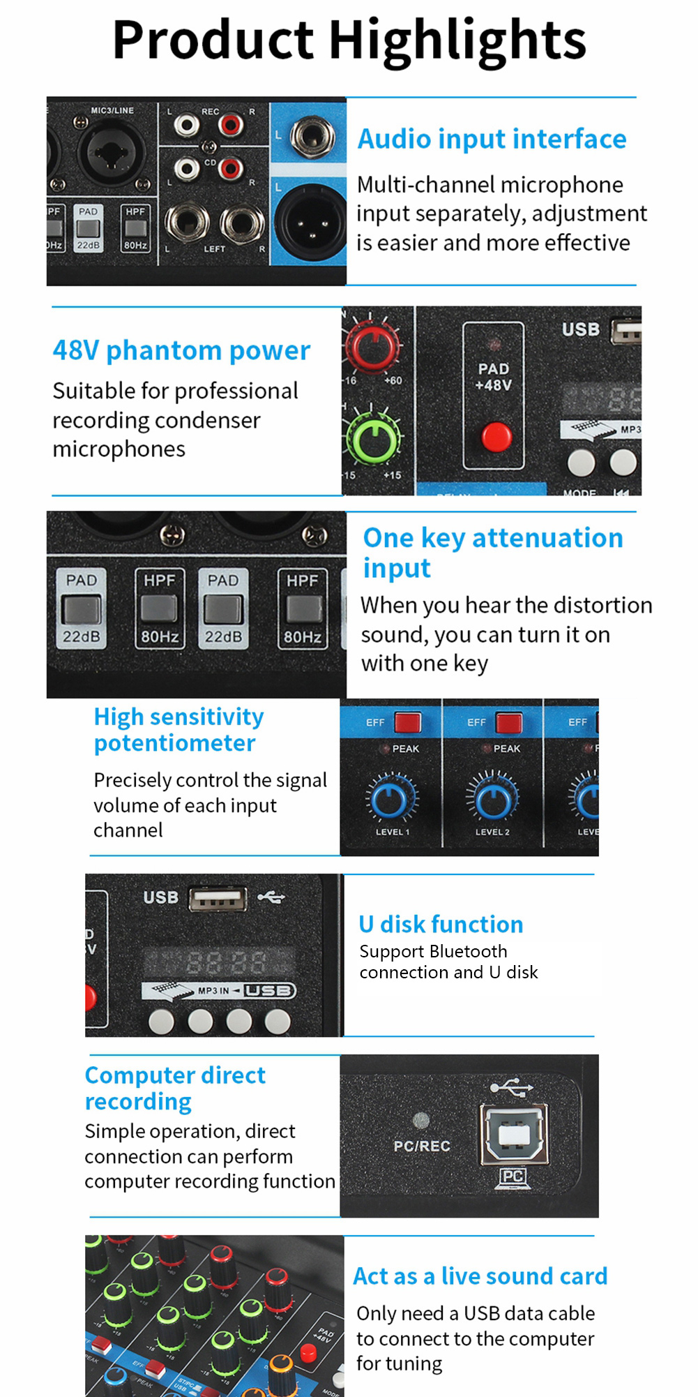 - Built-in 48V Phantom power supply for condenser microphones, high-definition headphone output port, MP3 player, Bluetooth receiver and sound card connected to PC.