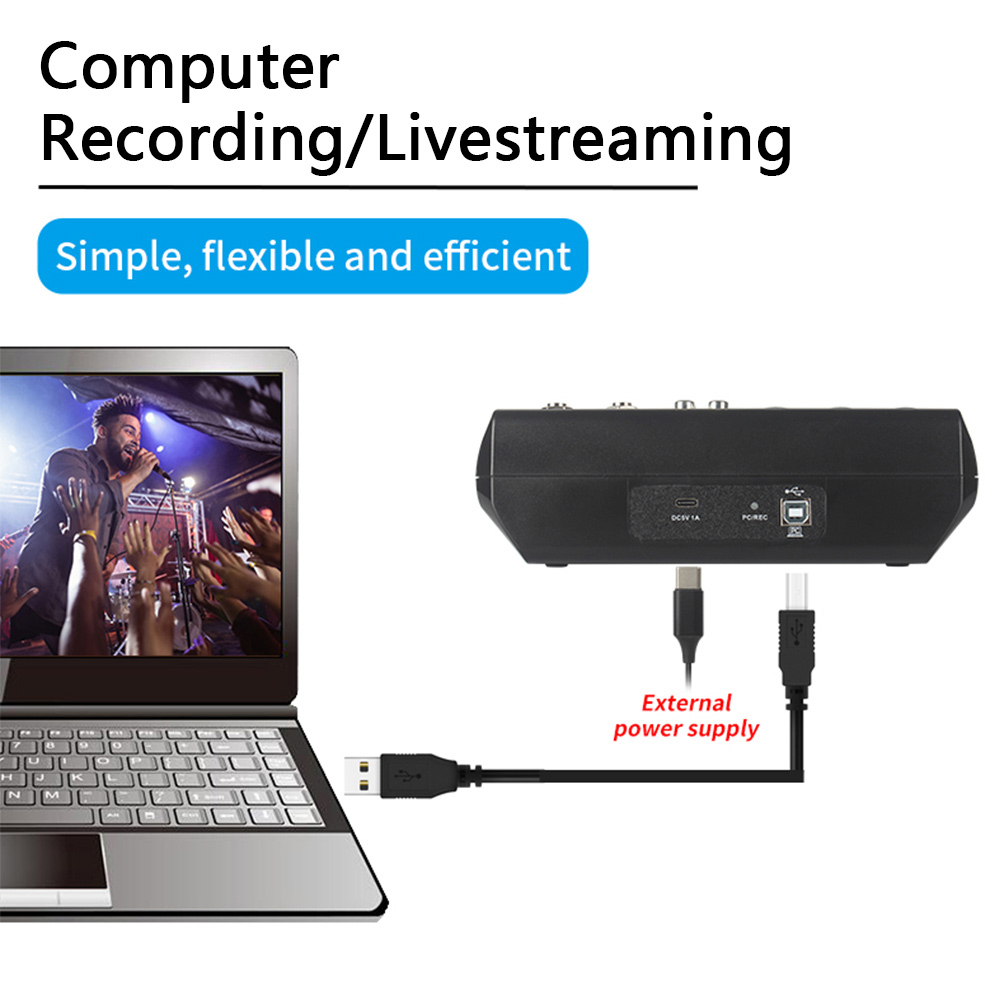 - No additional power supply is needed and eliminating the hassle of using an external adapter. The mixer can be connected directly to the USB port of the PC for power.