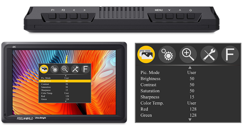 The menu controls are intuitive and easy to use. On the top of the monitor, you'll get the full button layout. Two different feature buttons which are programmable to the various features that you use the most. Maybe you could set one of the shortcut keys to the image flip function so that the screen can be flipped over quickly when shooting upside down.