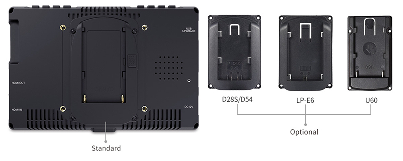 For power, there's a 12V DC input and a F970 plate (standard). You could connect the 12V DC input you get continuous power or it support F970 rechargeable type for Sony. You can also choose D28S/D54, LP-E6 or U60 plate to install other types for power supply.