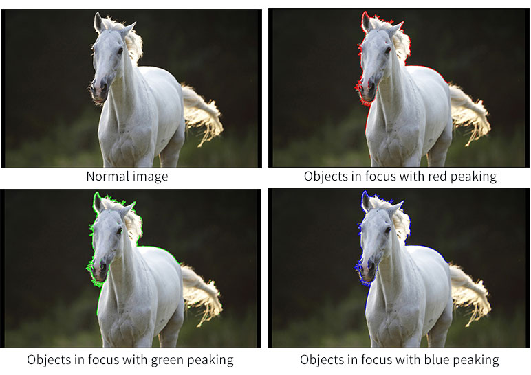 7. Peaking Focus Assist (Red,Green,Blue three colors optional highlight over parts of the image in focus)