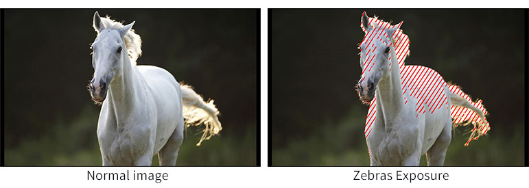 The Exposure is used to assist in exposure adjustment in the mode of Zebra Pattern. It is considered overexposed and displays the moving warning lines onto the over exposed areas. 1-100IRE adjustable.