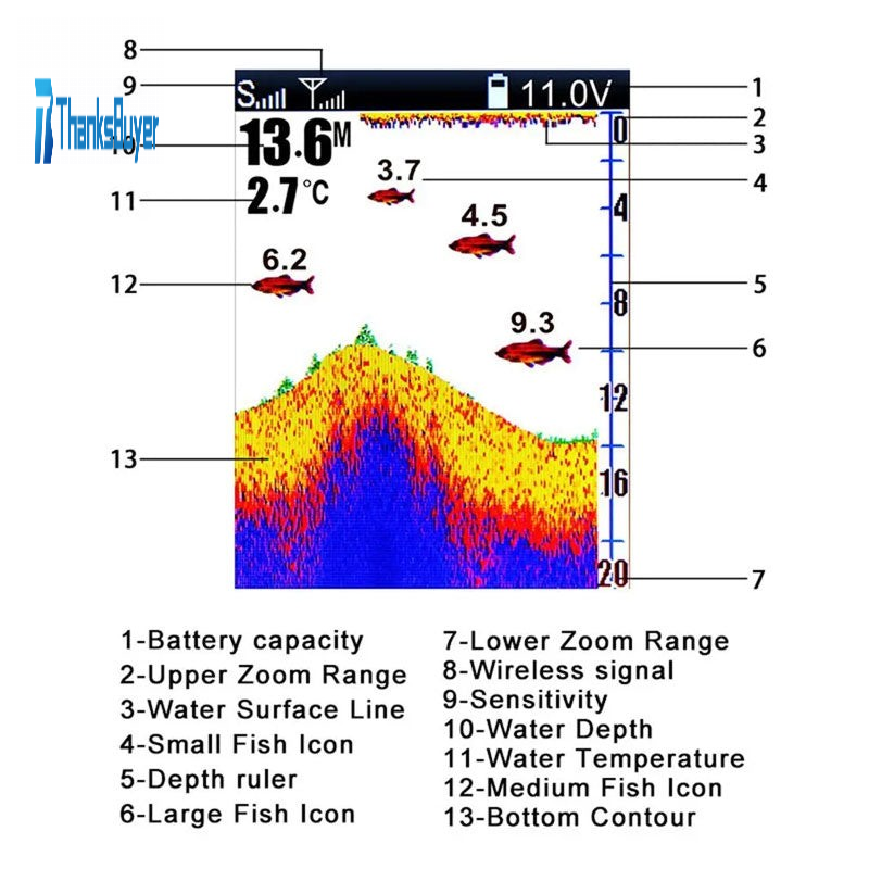 7) Water depth, water temperature, fish location and bottom contour can be constantly obtained from the water