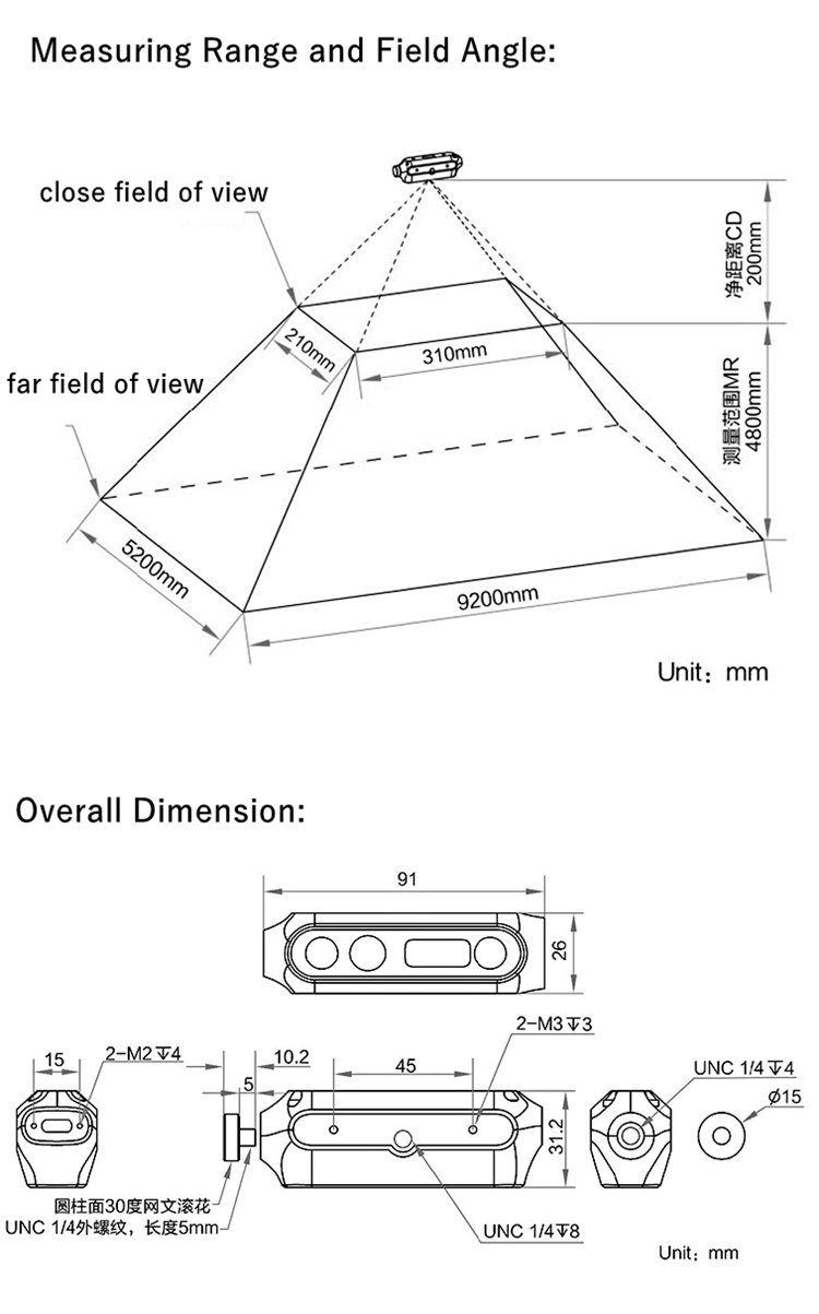 Installation: a 1/4-20 screw hole, 2 x M3 installation hole