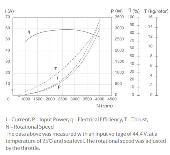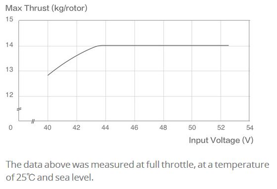 - Max Thrust: 14 kg/rotor (44.4 V, Sea Level)
