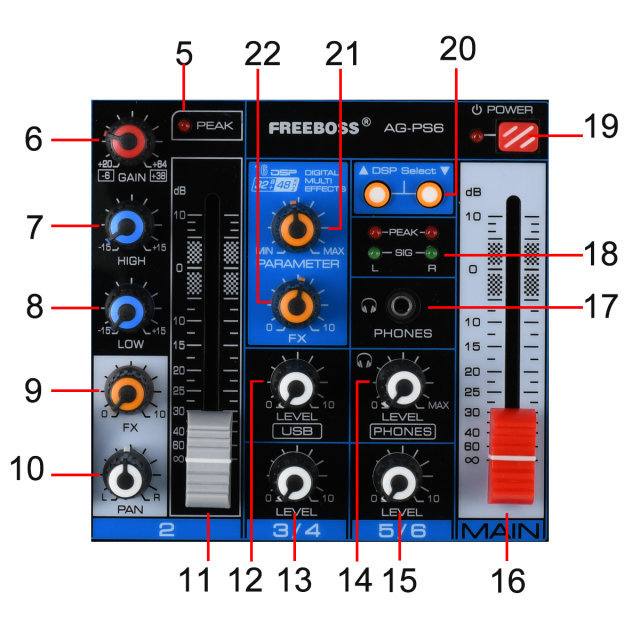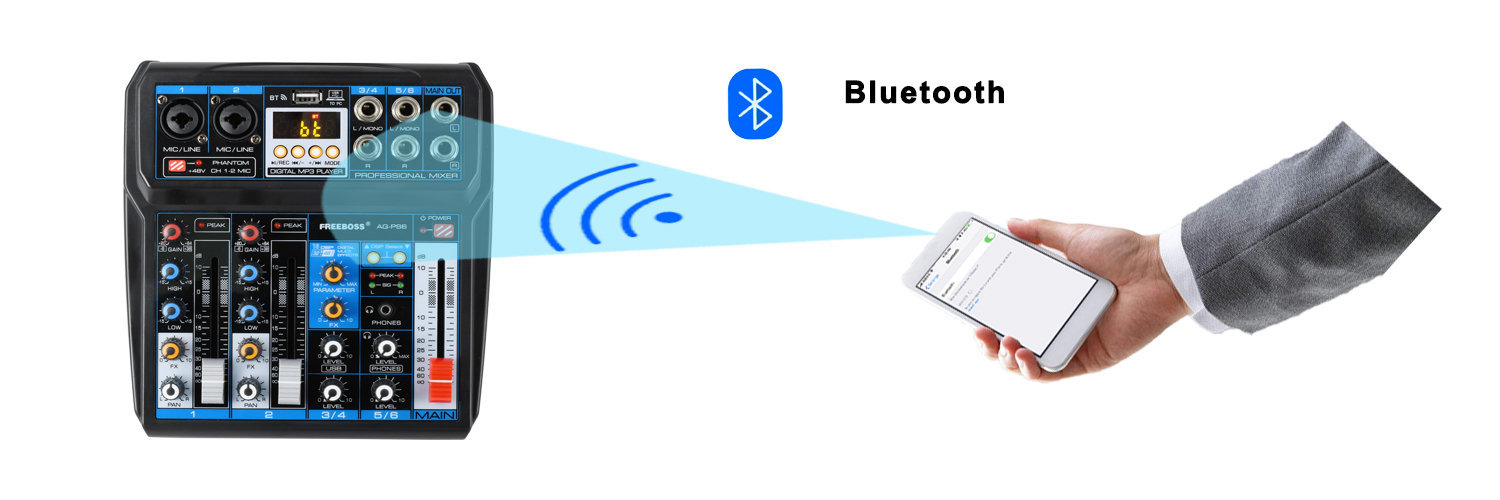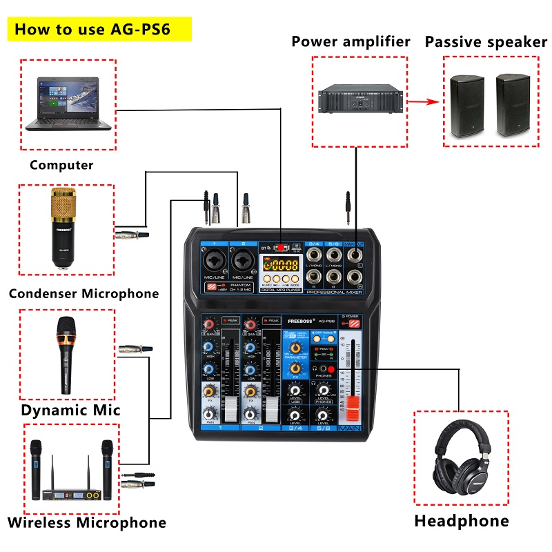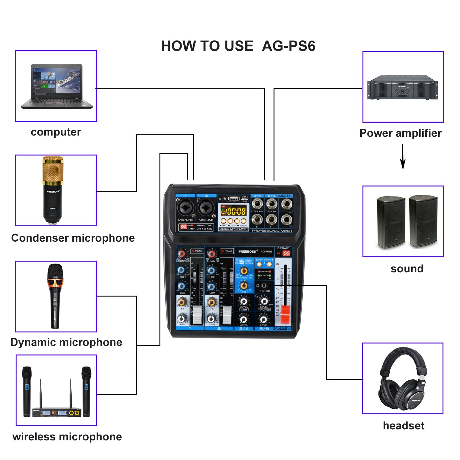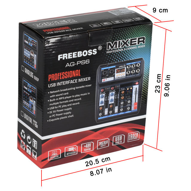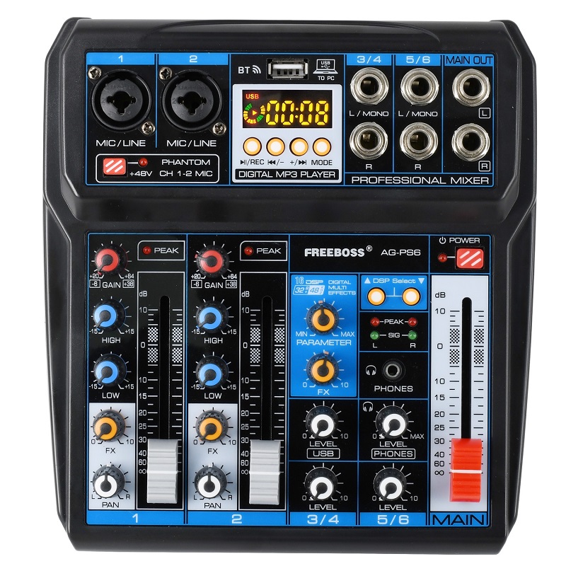 Details for Freeboss AG-PS6 DV 5V Power Supply USD Interface 6 Channel 2 Mono 2 Stereo 16 Digital Effects Audio Mixer