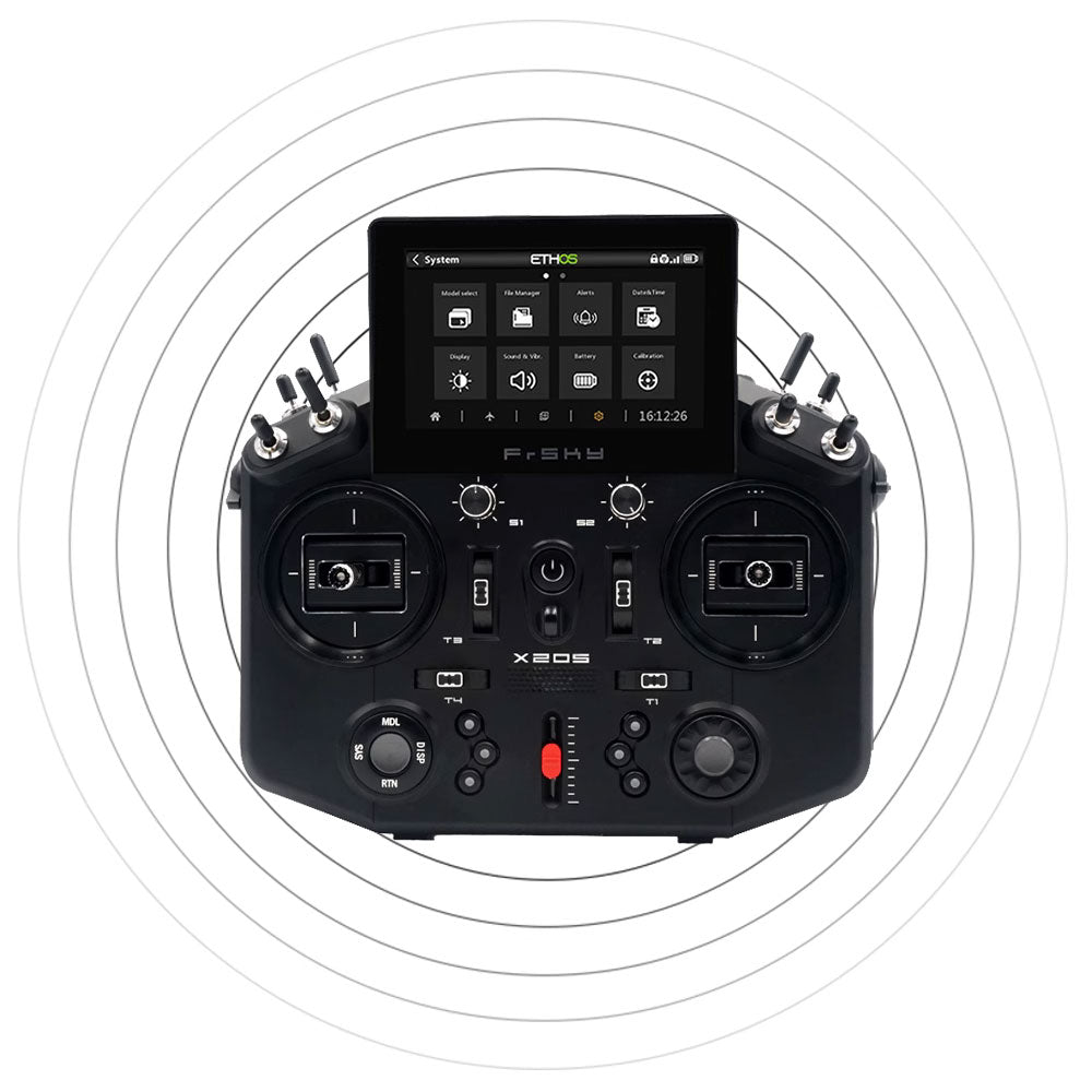 The FrSky Tandem X20 Series is a dual-band telemetry radio system, its development has drawn on valuable feedback from FrSky's extensive customer base, experience with previous radios and introduces many new features such as a color touch screen display, underpinned by an ergonomic design that provides unprecedented comfort when held. On the RF side, FrSky has introduced a powerful and reliable TD dual-band RF system, which features the advantages of the FrSky 900MHz and 2.4GHz in one combined RF system. The TD dual-band RF system is characterized by true simultaneous dual-band remote control with telemetry, and superb end-to-end 4ms latency performance. When combined with ETHOS, a completely new operating system, FrSky's Tandem X20 Series provides users with a powerful, intuitive, and flexible experience to enjoy across the entire world of RC.