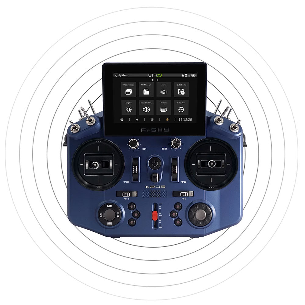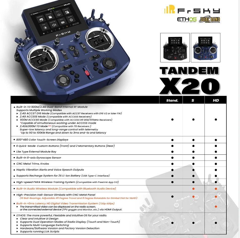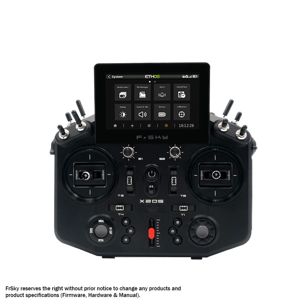 The FrSky Tandem X20 Series is a dual-band telemetry radio system, its development has drawn on valuable feedback from FrSky's extensive customer base, experience with previous radios and introduces many new features such as a color touch screen display, underpinned by an ergonomic design that provides unprecedented comfort when held. On the RF side, FrSky has introduced a powerful and reliable TD dual-band RF system, which features the advantages of the FrSky 900MHz and 2.4GHz in one combined RF system. The TD dual-band RF system is characterized by true simultaneous dual-band remote control with telemetry, and superb end-to-end 4ms latency performance. When combined with ETHOS, a completely new operating system, FrSky's Tandem X20 Series provides users with a powerful, intuitive, and flexible experience to enjoy across the entire world of RC.
