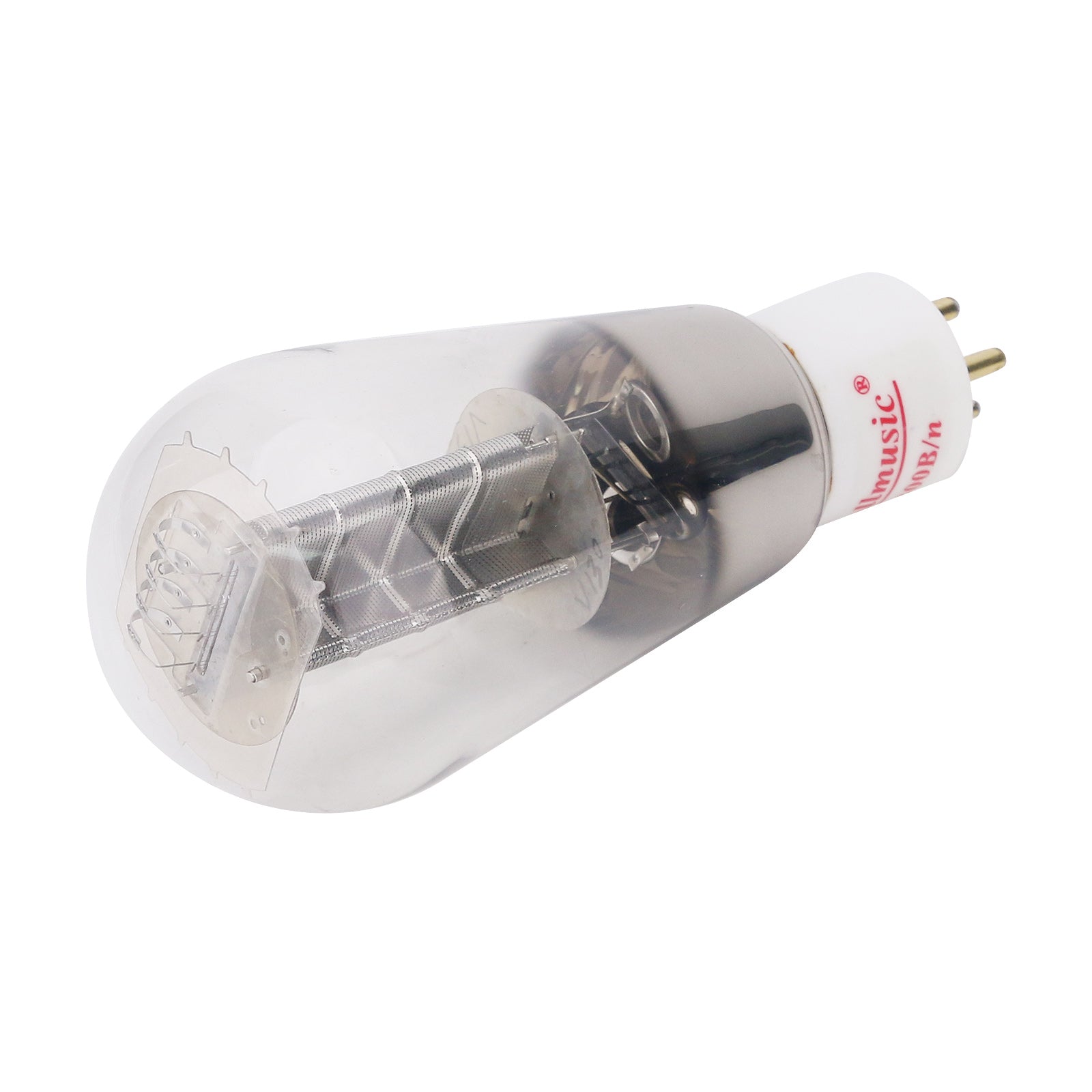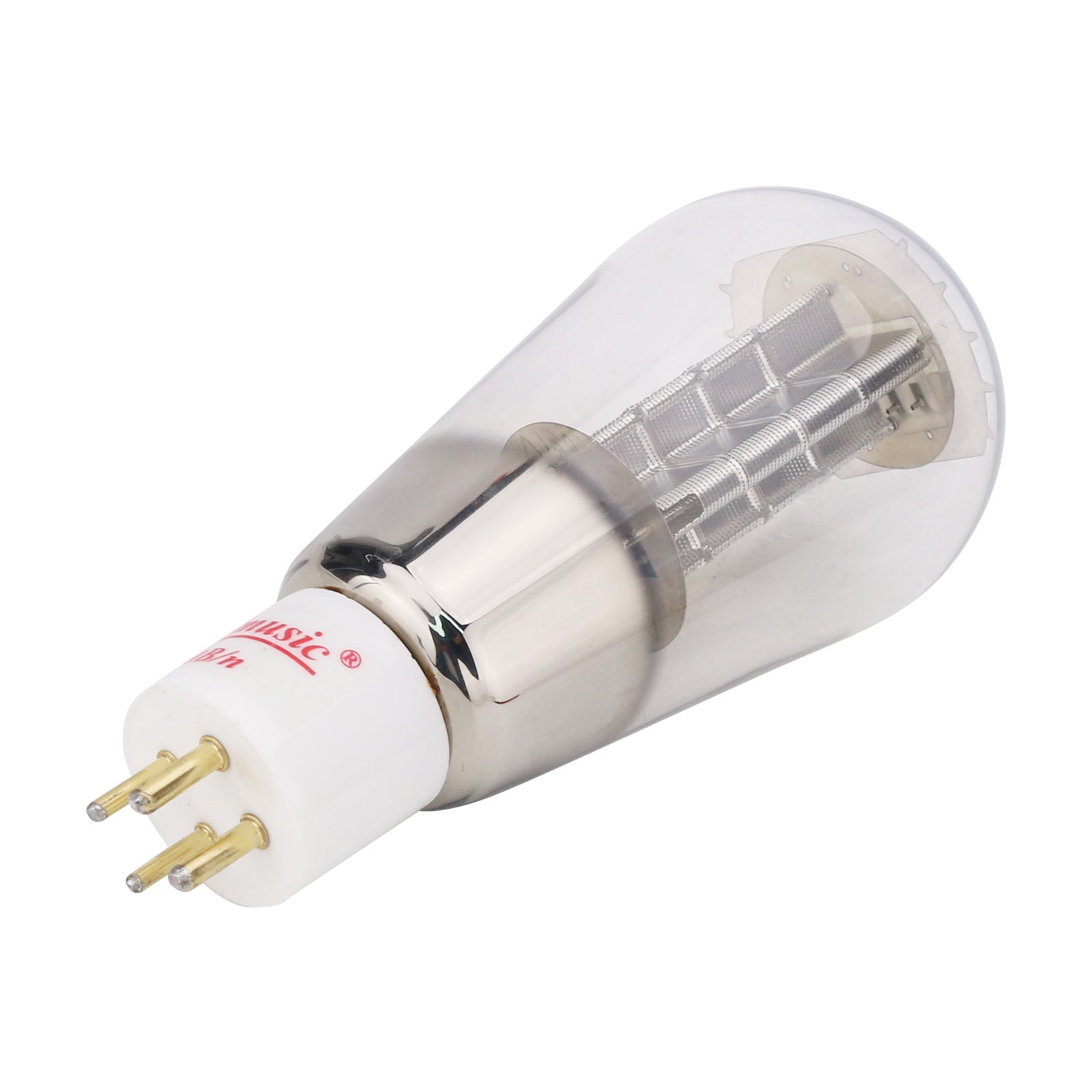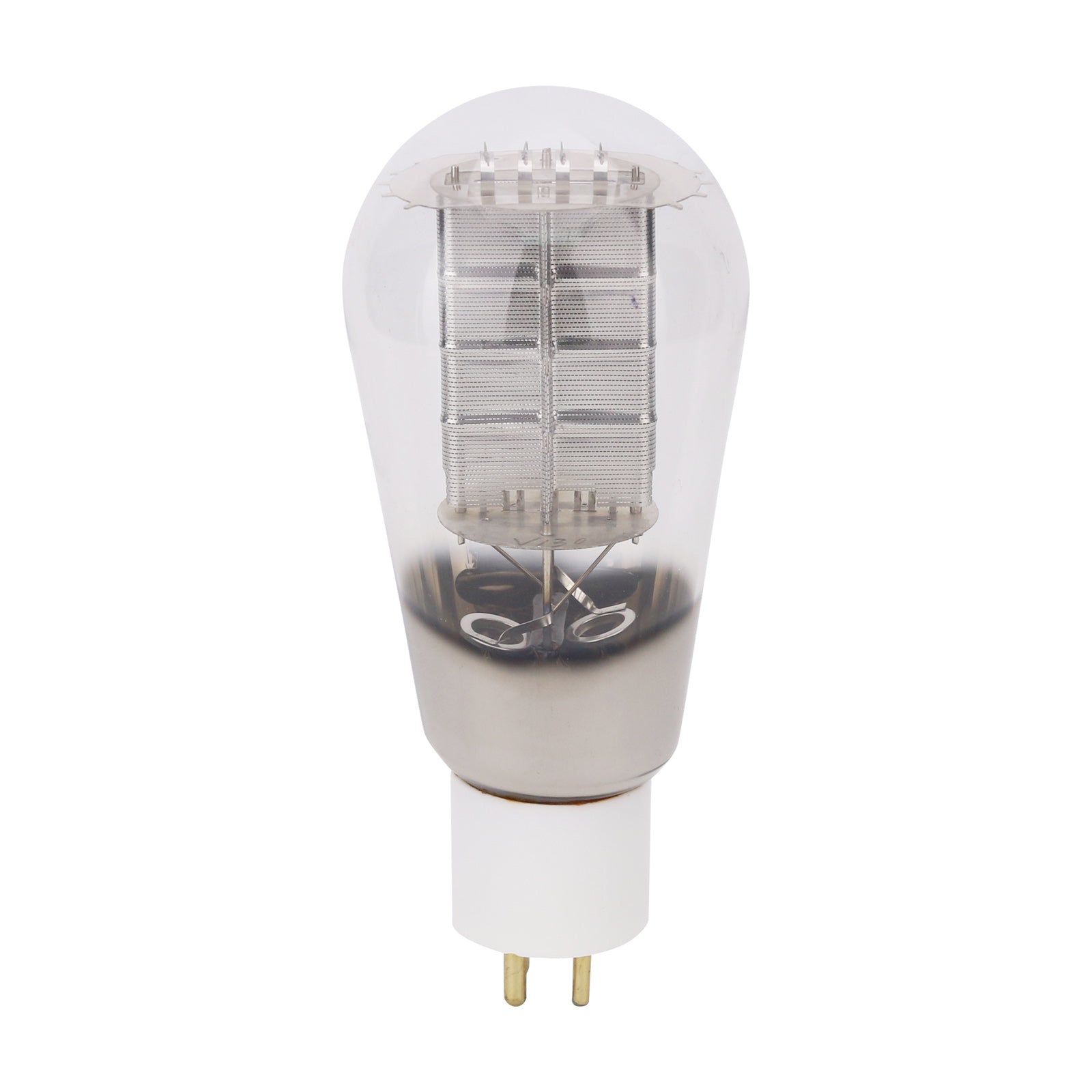- 300B/n electron tube with a white porcelain base, a mesh plate (anode), four gold-plated pins and a directly heated transistor