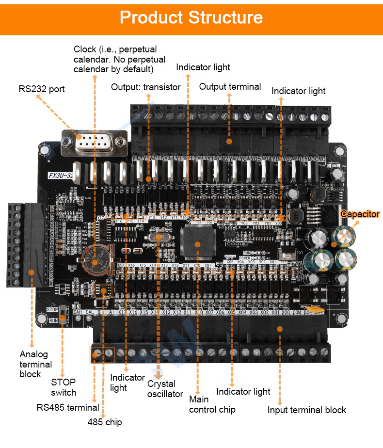 - Input point X element: X0-X17, DC24V input and low-level active. X0-5 are high-speed counting input ports (12KHZ). 60KHZ is optional, and an additional charge is required