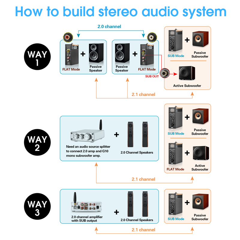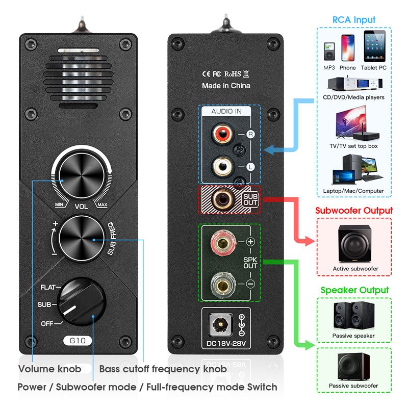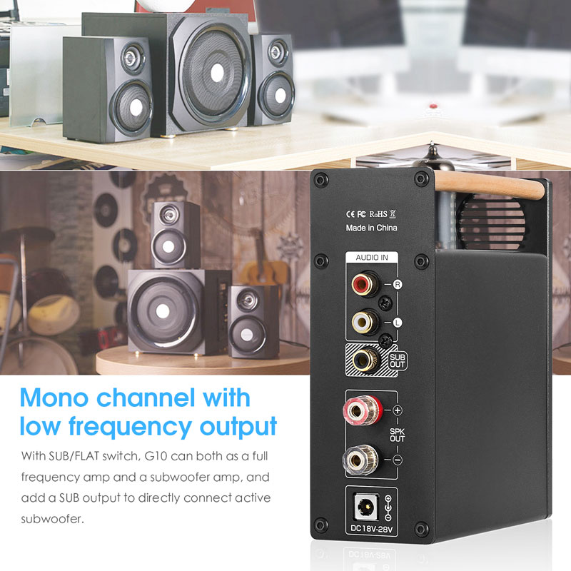 - Mono channel with low frequency output: With SUB/FLAT switch, G10 can works as a full frequency amp and a subwoofer amp, and add SUB OUT ports to directly connect active subwoofer. 2pcs G10 can drive left and right channel independently to avoid mutual interference, easy to build 2.0/2.1channel system
