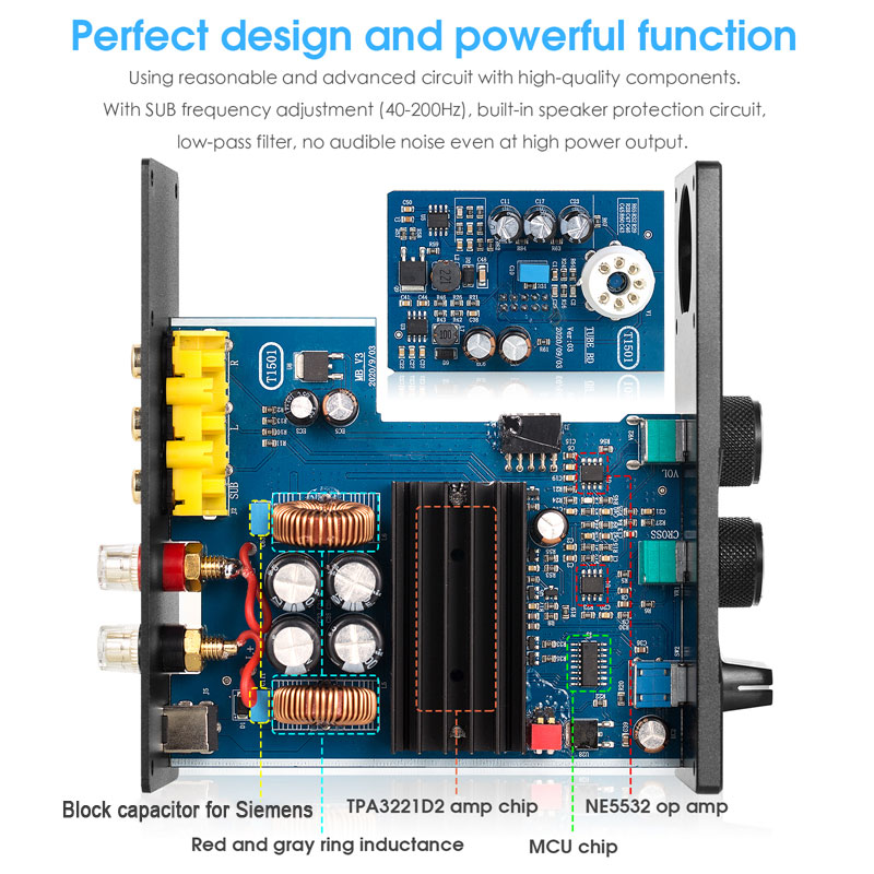 - Perfect design and powerful function: Using reasonable and advanced circuit with high-quality components. With SUB frequency adjustment (40-200Hz), built-in speaker protection circuit, low-pass filter, no audible noise even at high power output