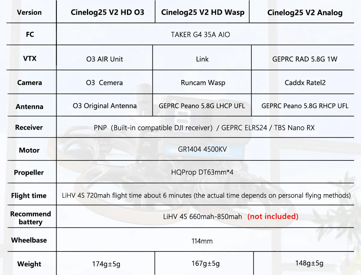 - Cinelog25 V2 is a 2.5-inch high-definition FPV that integrates indoor and outdoor flying. Developed by the GEPRC team, the flight feels delicate and the experience is good.