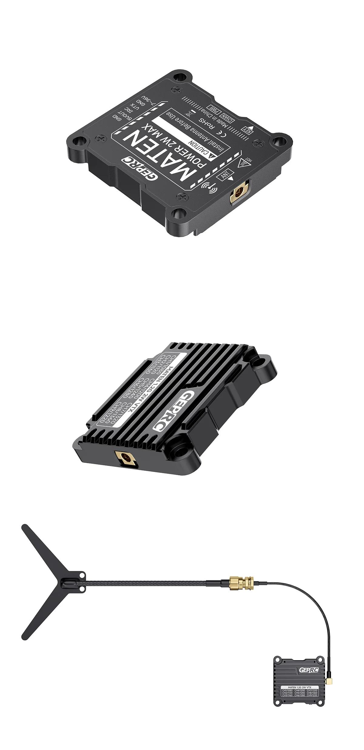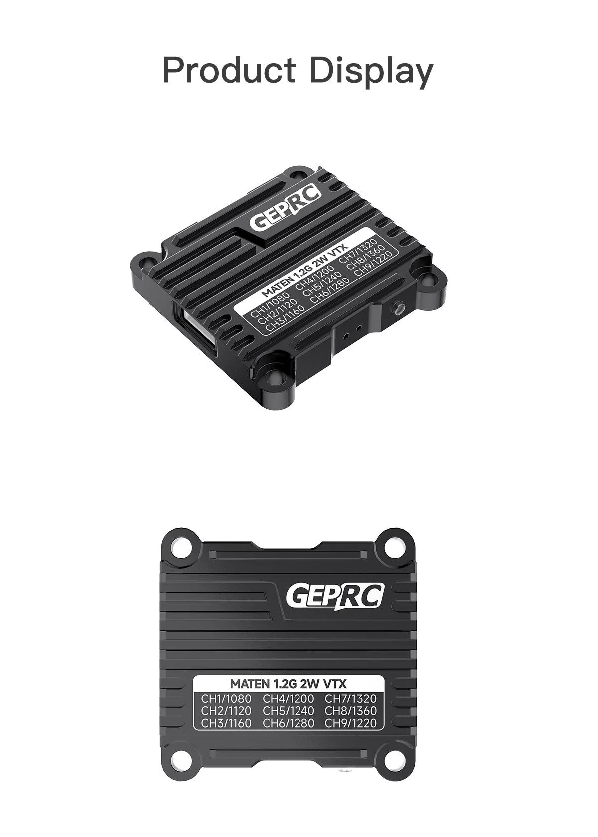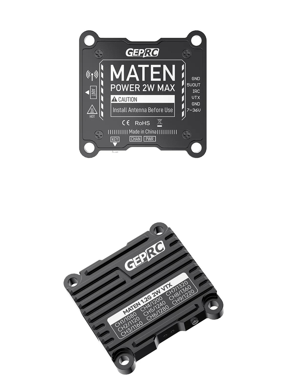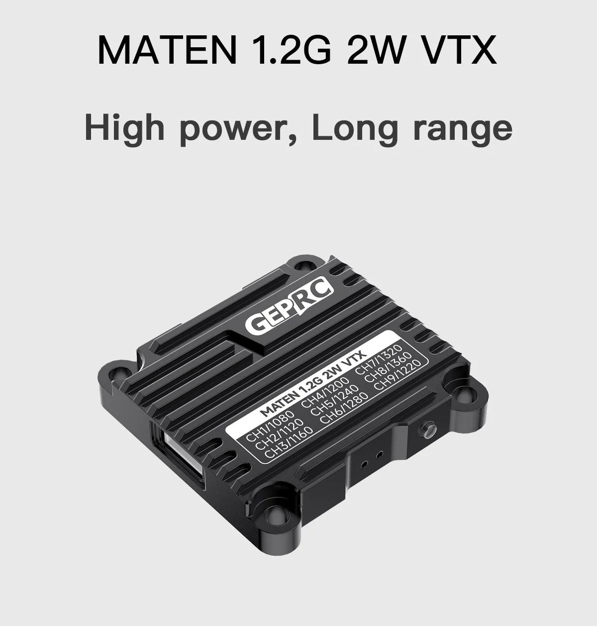 - The MATEN 1.2G 2W VTX high-power image transmission newly developed by the GEPRC team is now officially released. Its performance is very powerful, with 4 adjustable power levels and a maximum power of up to 2000mW. The transmission signal is very stable and the penetration ability is excellent.