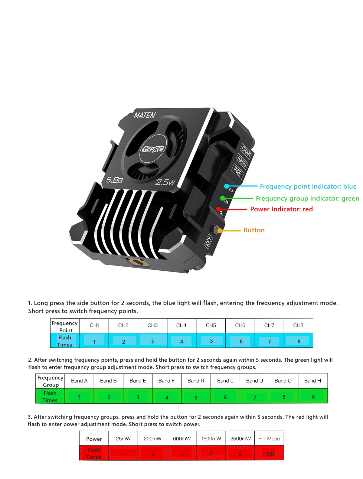 - Output power: 25mW/200mW/600mW/1600mW/2500mW/Pit mode