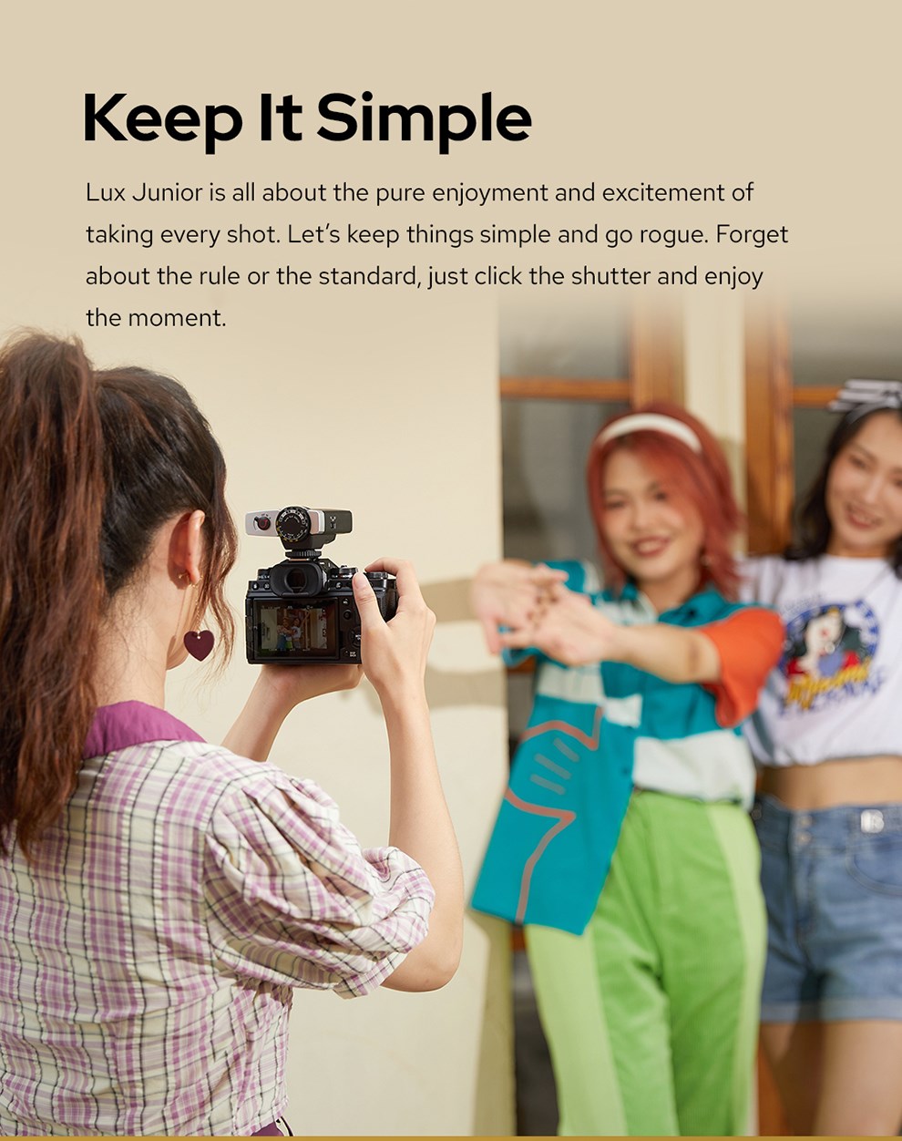 Lux Junior is all about the pure enjoyment and excitement of taking every shot. Let's keep things simple and go rogue.Forget about the rule or the standard, just click the shutter and enjoy the moment.