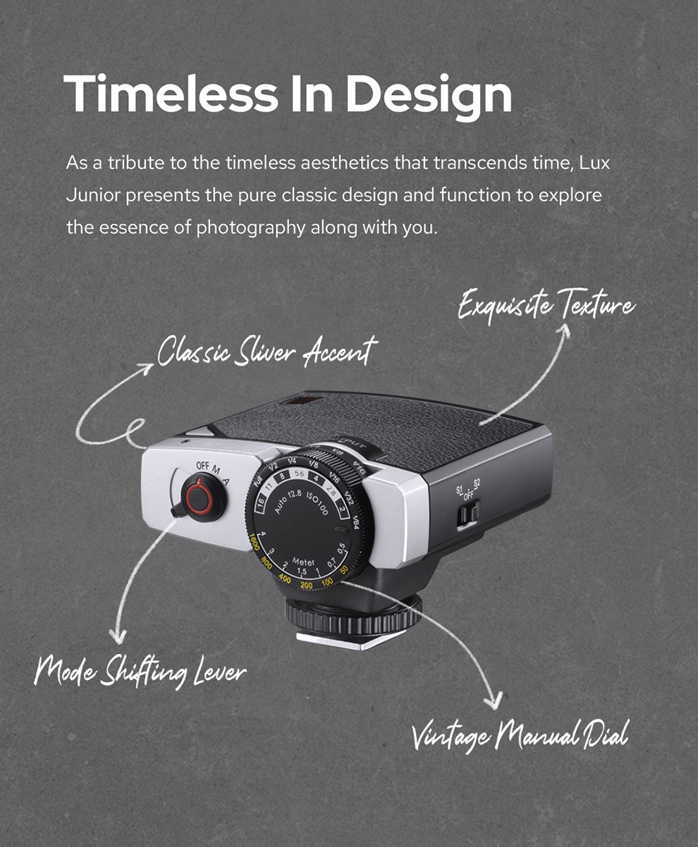 As a tribute to the timeless aesthetics that transcends time, Lux Junior presents the pure classic design and function to explore the essence of photography along with you and turn your nostalgia into tangible beauty.