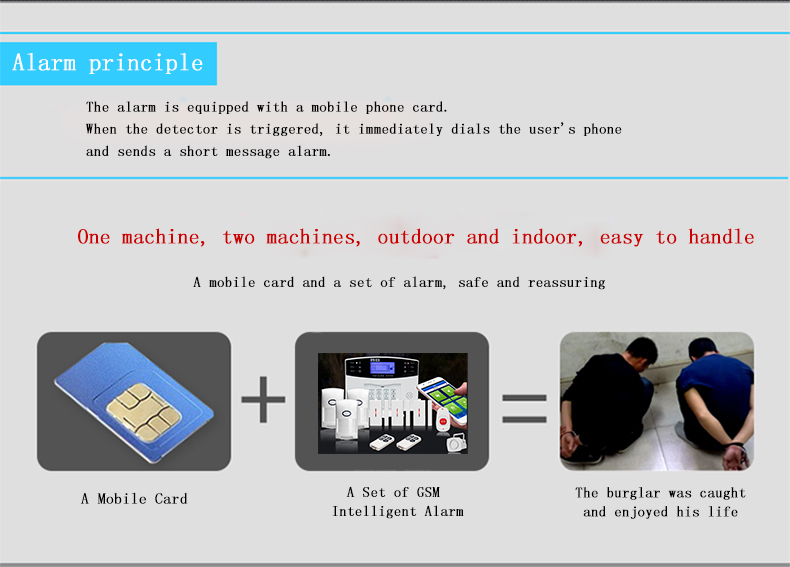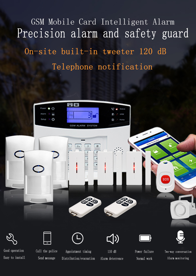 It combines advanced GSM digital signal, network technology with peripheral sensing detection technology. When the main unit is in arming status and there are intruders, the sensing detector will immediately send a wireless signal to it which will report the alarm and places through automatic audio phone calls or SMS. It is widely used in homes, factories, schools, shops, convenience stores, finance rooms, villas, residential areas and other places that need protection.
