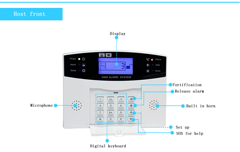 It is mainly used to control the main unit. You can get the host enter the armed state when you are going out. Press the host to unlock the state when you get home. You can make the host enter the home arming state when you are at home. Or press the SOS button in it to get the main unit to make a phone call when it is in emergency.