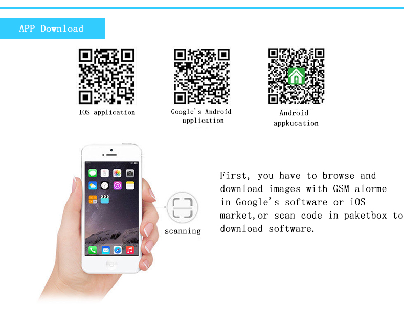 - APP Download: For Apple App Store, please search GSM Alarm; For Android App Store, please search GSM Alarm; or you can scan the package instructions.