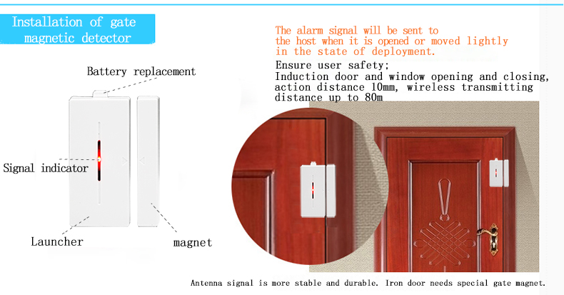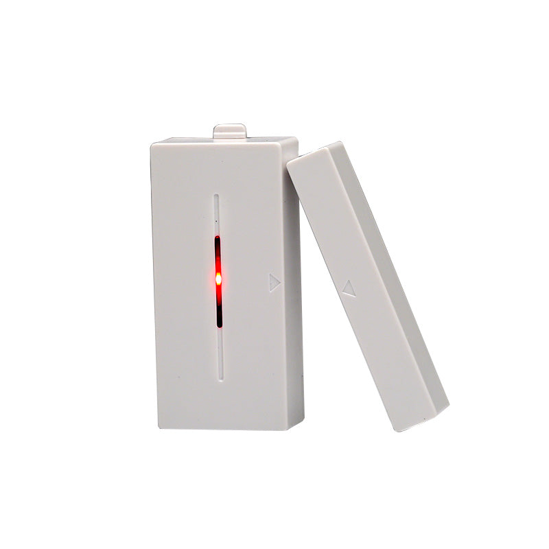 The wireless door magnetic detectors detect whether the door, window, drawer, etc. are illegally opened. They are mainly used with the alarm host. When the host is in arming state and its owner stays outdoors, as long as the door or window is illegally opened, the sensors will send alarm signal to the host which will send out alarm report. Their effective working range between open space and the main unit is 200-300 meters.